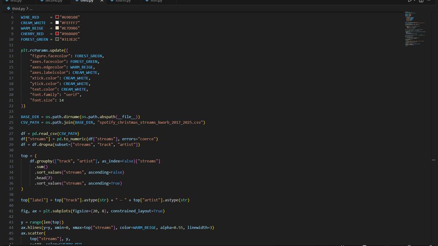 В этом исследовании я рассматриваю динамику популярности рождественской музыки в Spotify с 2017 по 2025 год. Особое внимание уделено определению композиций, вносящих основной вклад в общее число прослушиваний в период рождественских праздников.