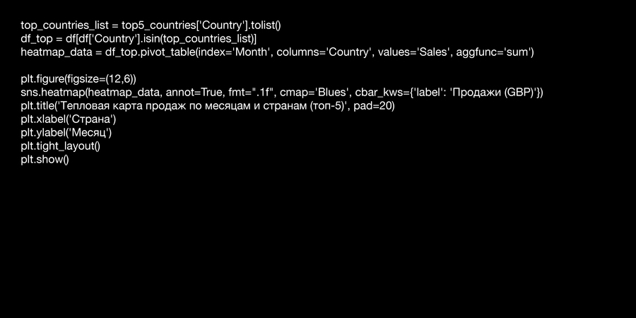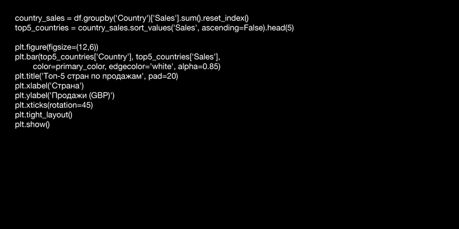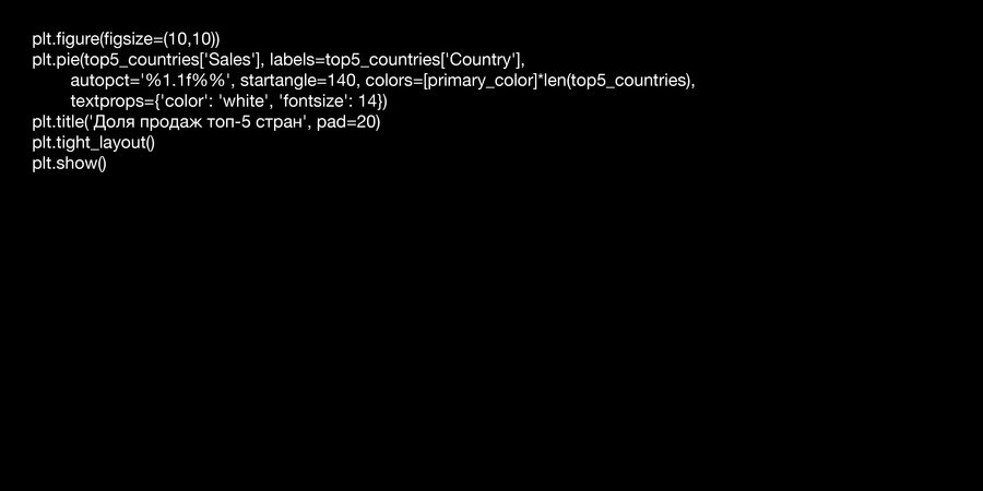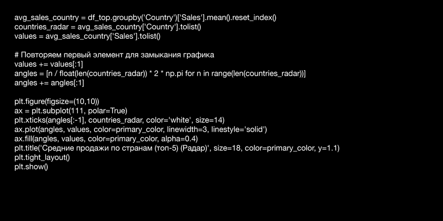 Радарная диаграмма для сравнения средних продаж по странам (топ-5)