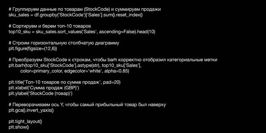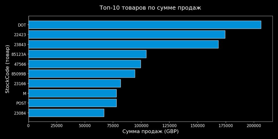 Горизонтальная столбчатая диаграмма топ-10 товаров по сумме продаж