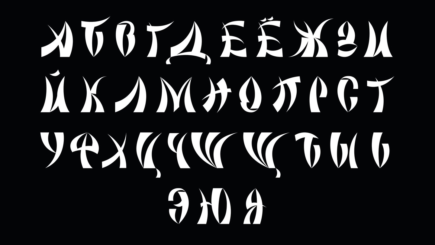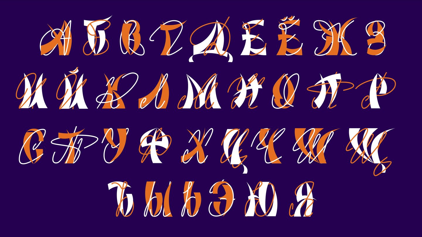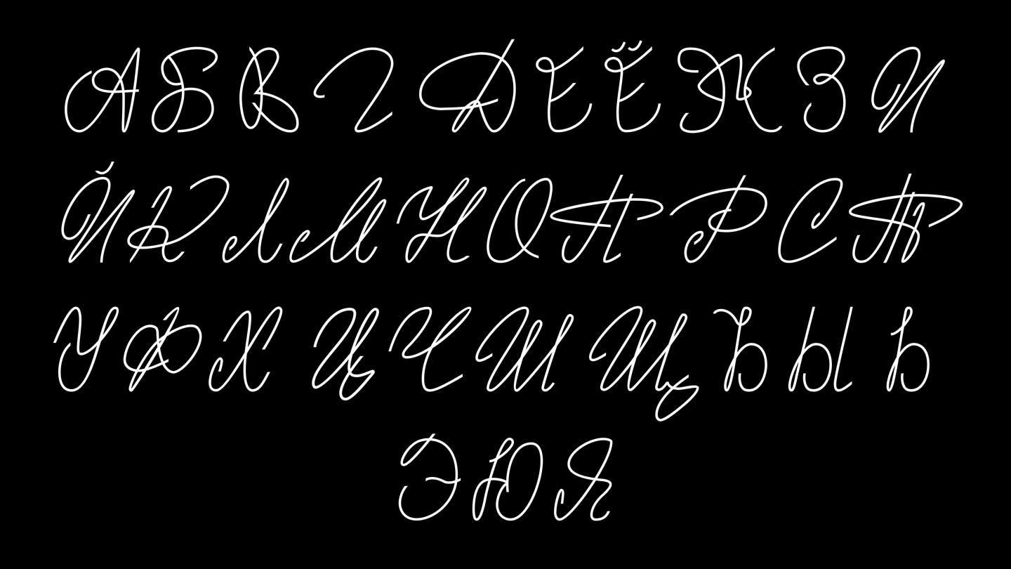 Шрифт состоит из двух частей: первая — имитация письма прямым пером, вторая — интерпритация современного прописного почерка.