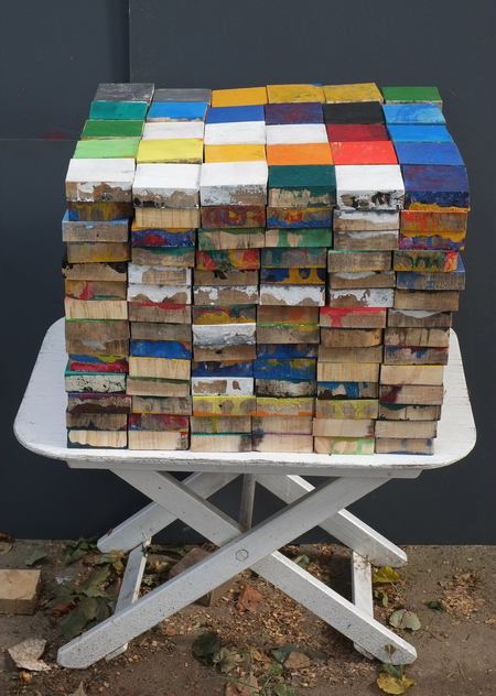 Перпетуум-Мобиле — 420 модулей (2020-2024), покрашенные с двух сторон, как шестеренки большого механизма переворачиваются, создавая новые импульсы. Работа динамичная и меняется под воздействием времени и обстоятельств меня окружающих.