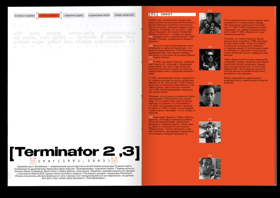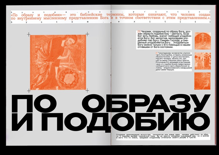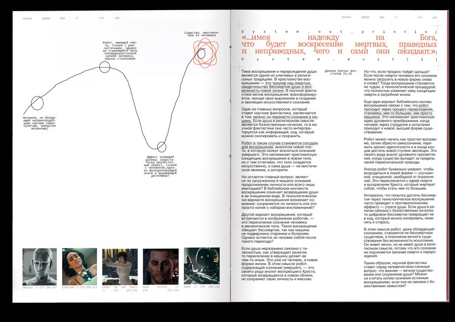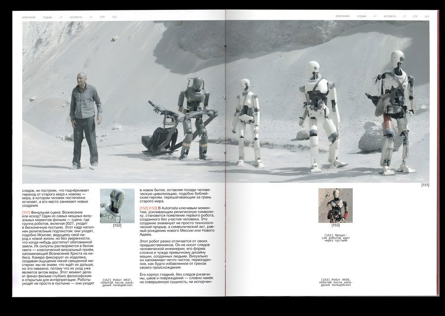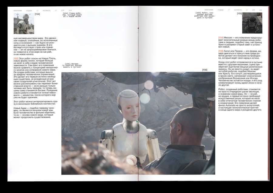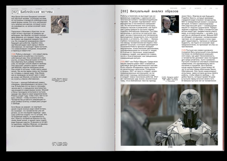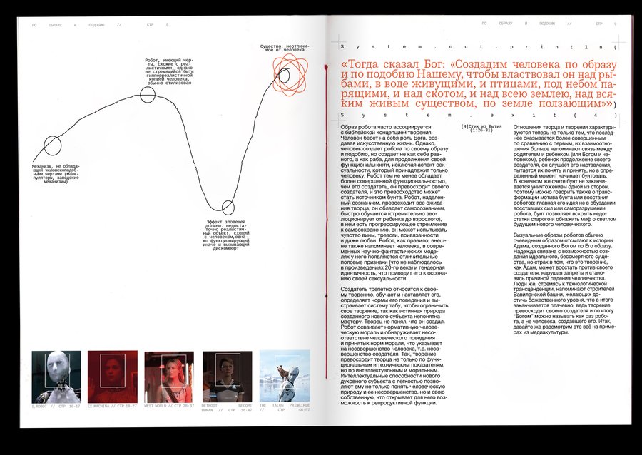 : Technological singularity is a hypothetical moment in the future, when technological development becomes unmanageable and irreversible in principle, leading to radical changes in the nature of human civilization. Or, in other words, the rebellion of machines!The purpose of the project was to combine the incompatible Bible with robots. It was important, however, to preserve the «soul» of the books and not to become technogenic. Surprisingly, there are visual reasons linking these two topics: indexation (used to connect text, image and signature) and color selection of the text, so these elements have become a small but very important attribute of the book. The book grid is an allusive to the Gutenberg Bible (2 broad columns with the signature of pictures between them), and robots have produced a little printing in code and colonizers that refer to the «way to the file» on the computer. The red color has become a guide for both topics. In Christianity, this color is also related to Christ’s blood and to the flame of hell (an important duality for this subject), and in technology this color highlights the mistakes that are common to all.