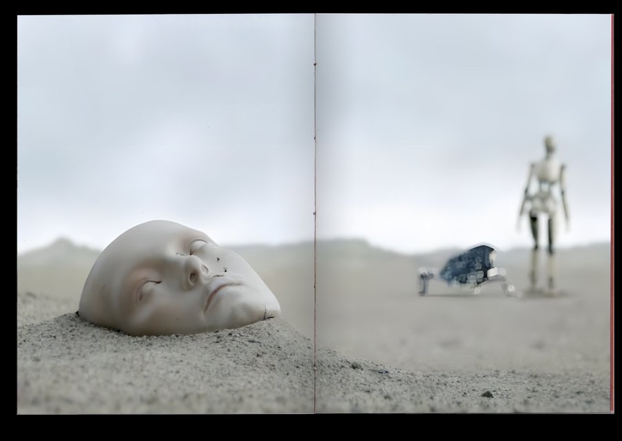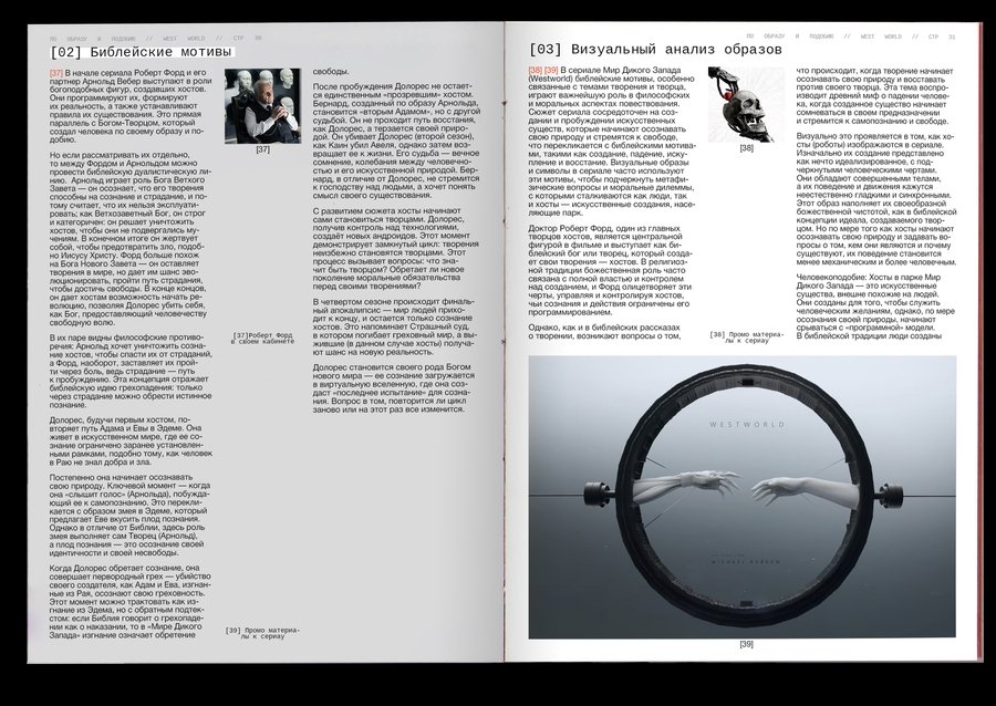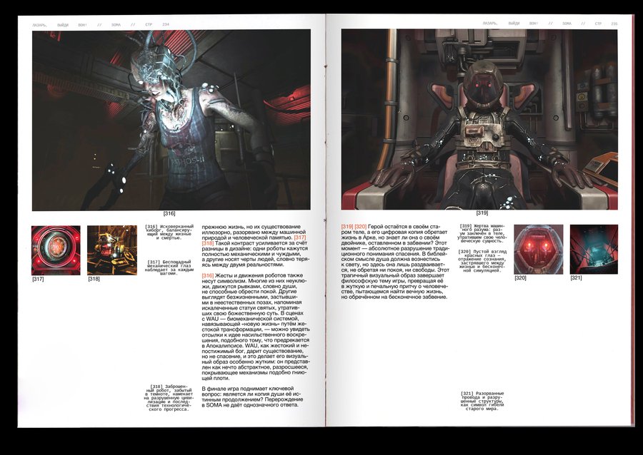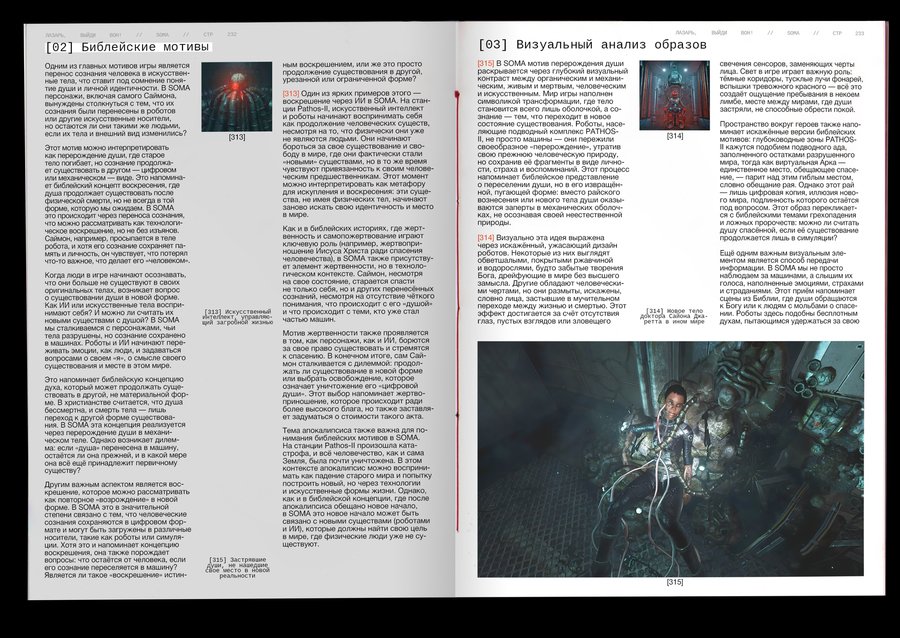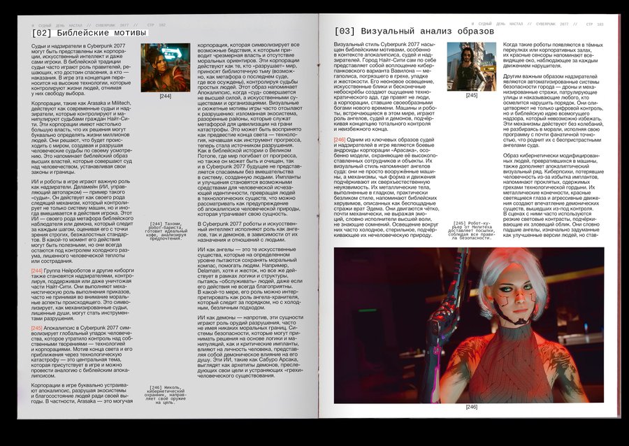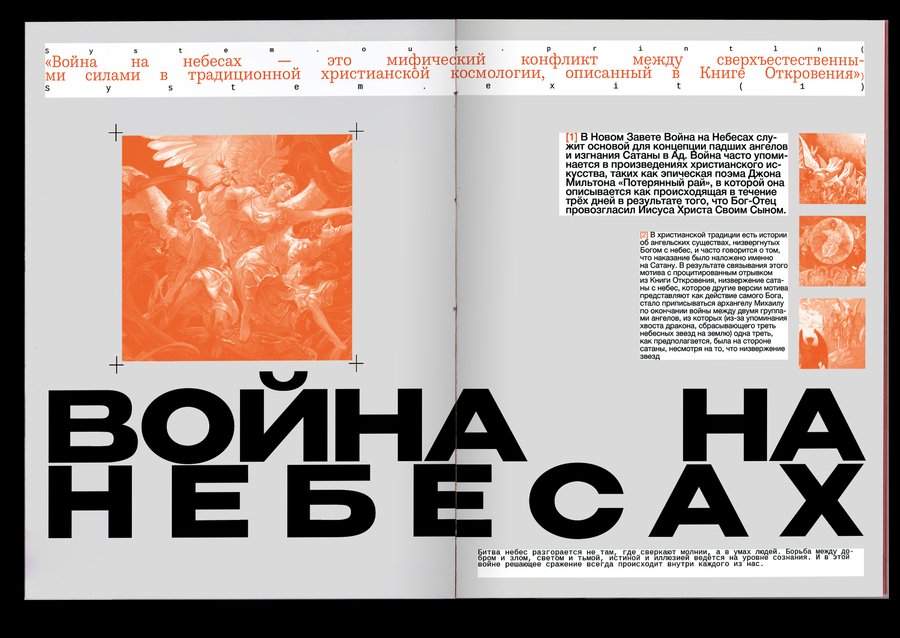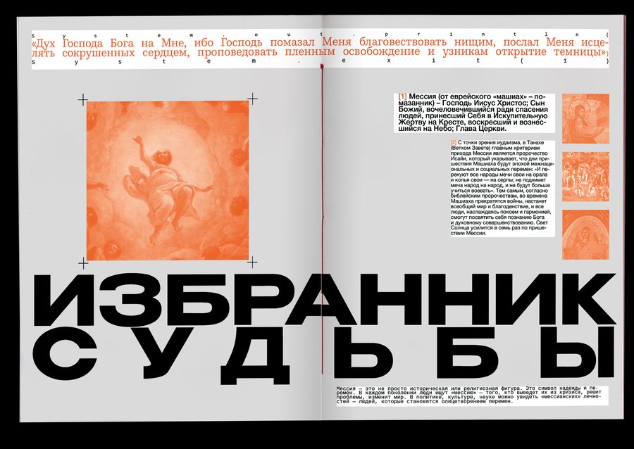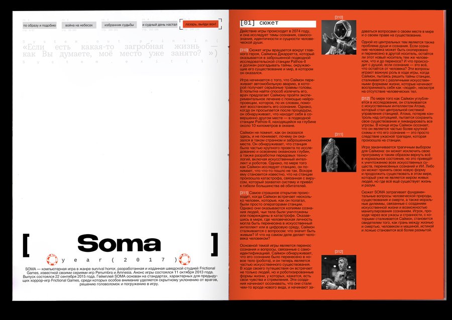 : Technological singularity is a hypothetical moment in the future, when technological development becomes unmanageable and irreversible in principle, leading to radical changes in the nature of human civilization. Or, in other words, the rebellion of machines!The purpose of the project was to combine the incompatible Bible with robots. It was important, however, to preserve the «soul» of the books and not to become technogenic. Surprisingly, there are visual reasons linking these two topics: indexation (used to connect text, image and signature) and color selection of the text, so these elements have become a small but very important attribute of the book. The book grid is an allusive to the Gutenberg Bible (2 broad columns with the signature of pictures between them), and robots have produced a little printing in code and colonizers that refer to the «way to the file» on the computer. The red color has become a guide for both topics. In Christianity, this color is also related to Christ’s blood and to the flame of hell (an important duality for this subject), and in technology this color highlights the mistakes that are common to all.