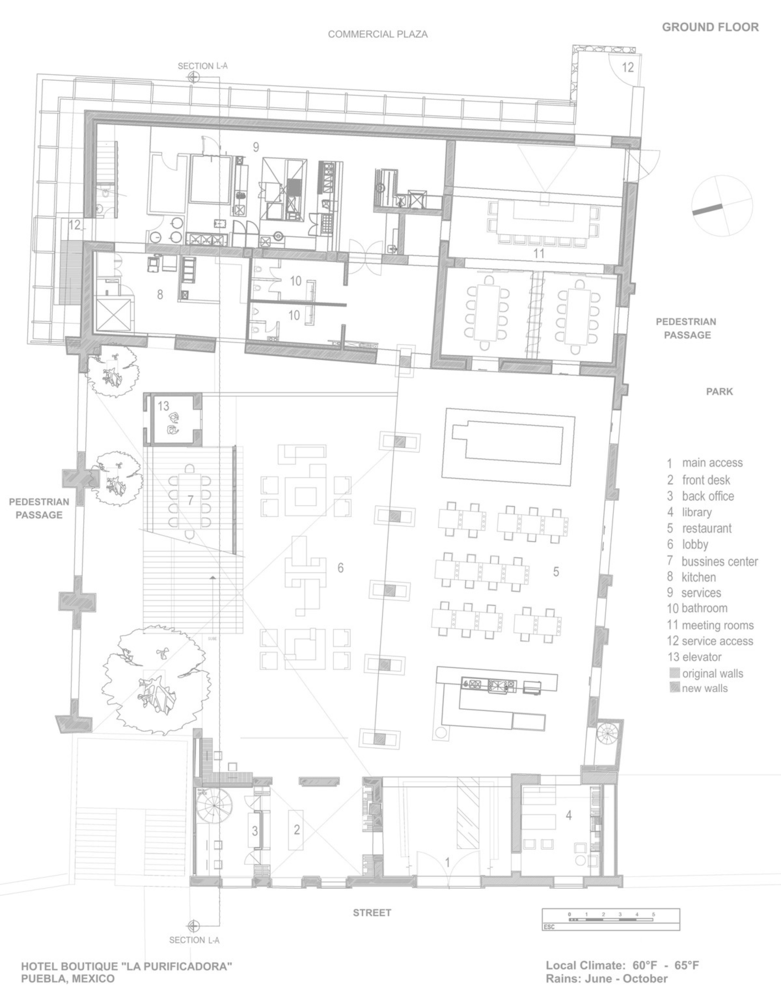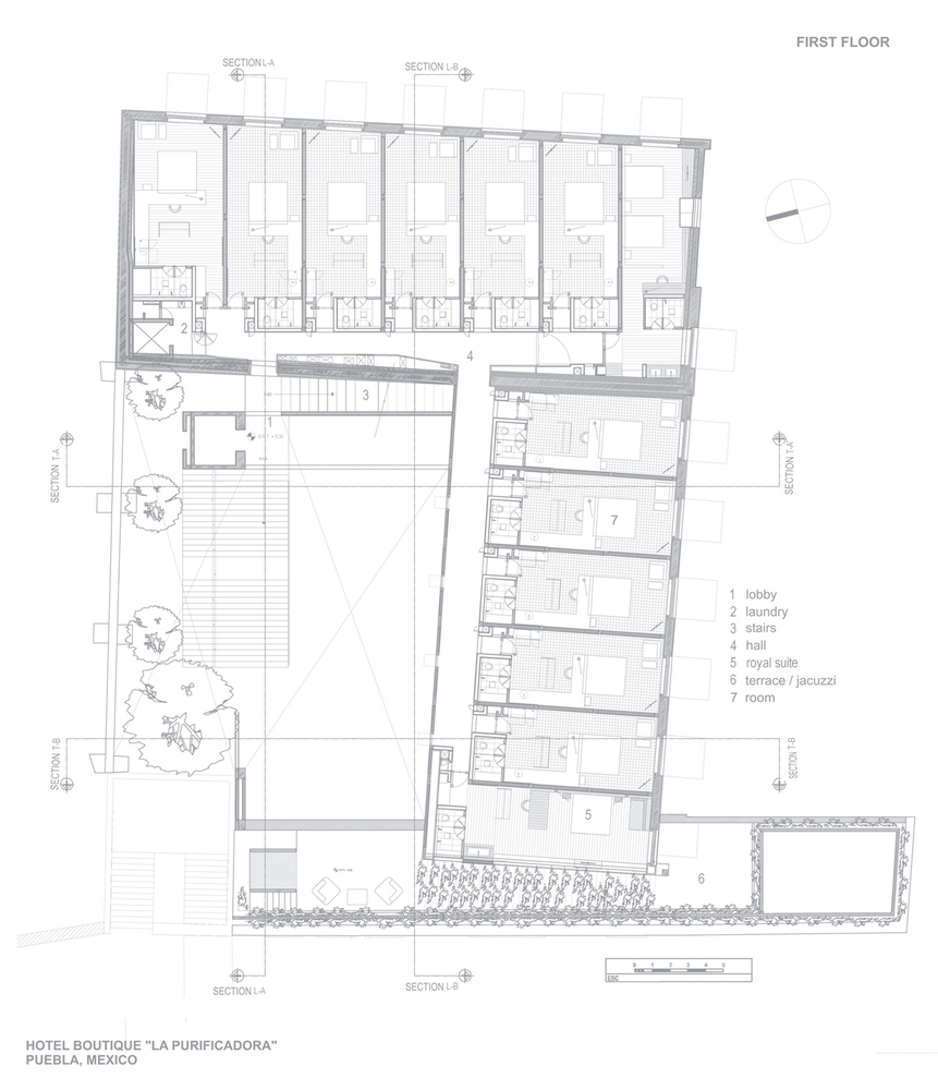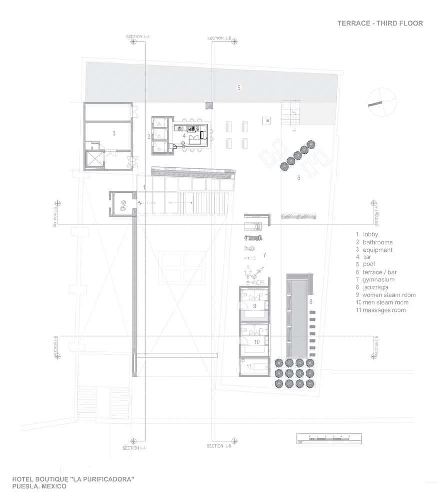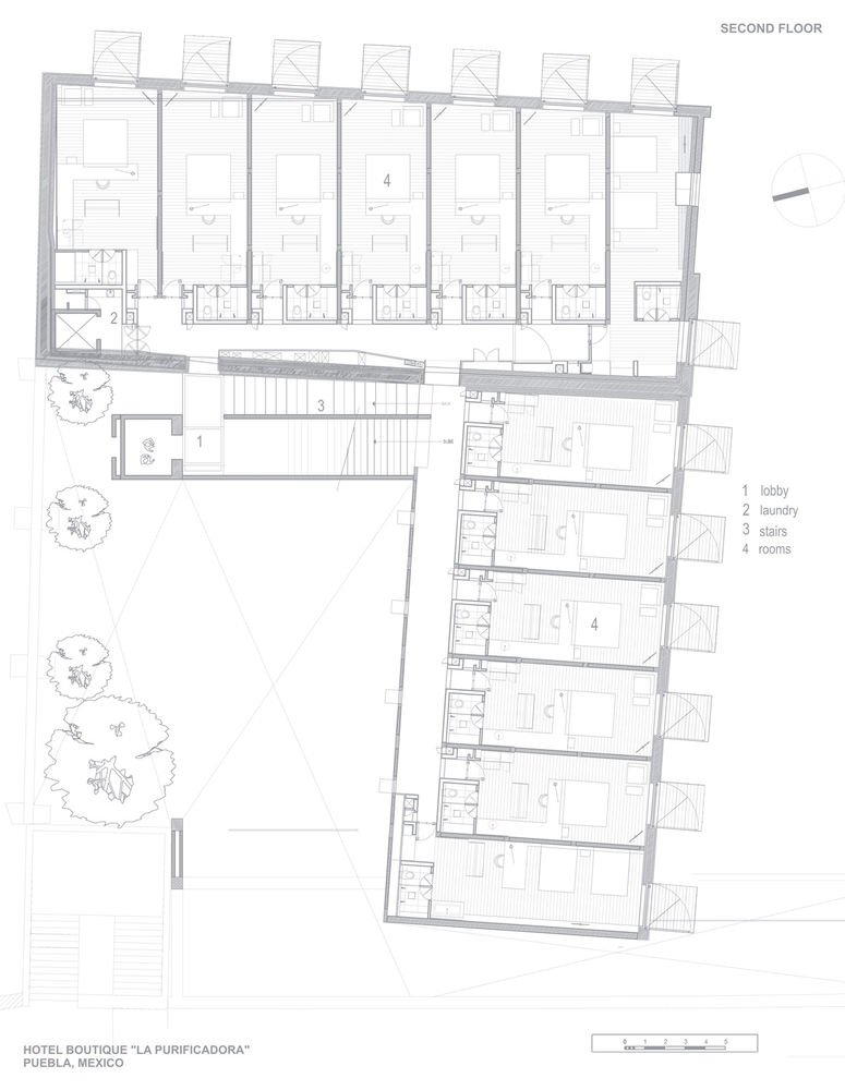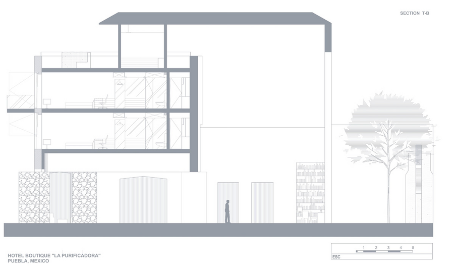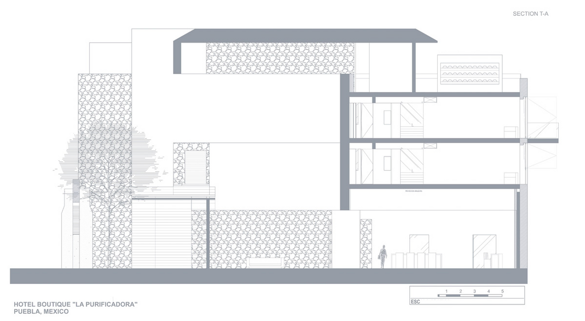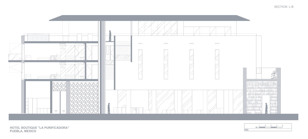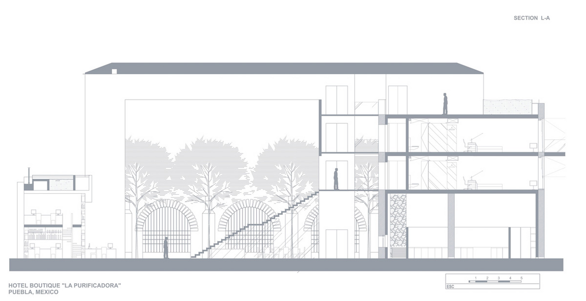 Бутик-отель La Purificadora в Пуэбле создан на основе бывшей фабрики по очистке воды, являющейся объектом исторического наследия. Проект сохранил аутентичные материалы — камень и древесину, контрастирующие со стеклом и сталью. Ключевым элементом стал четырехэтажный внутренний двор, окруженный Г-образными галереями. Найденные при реставрации артефакты были интегрированы в фирменный стиль отеля.