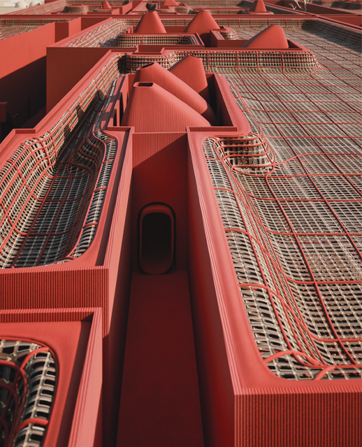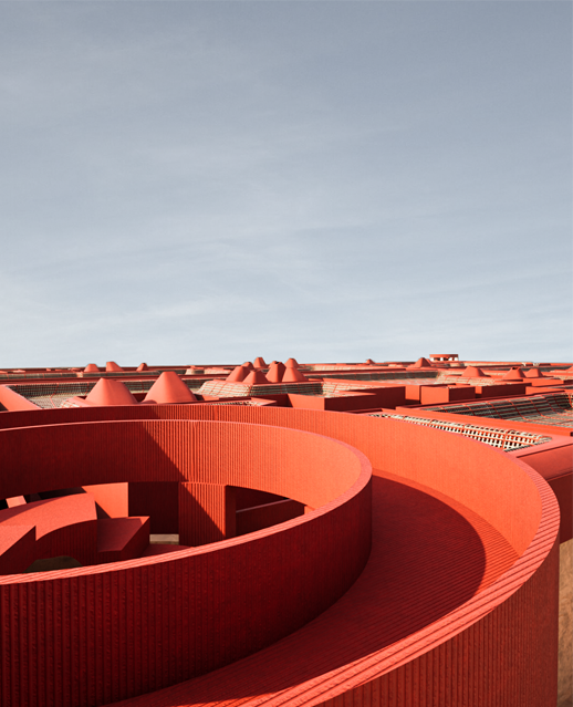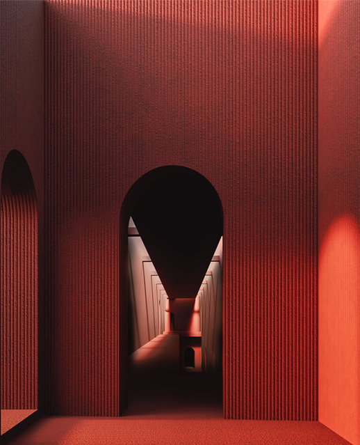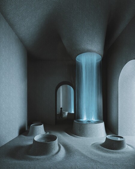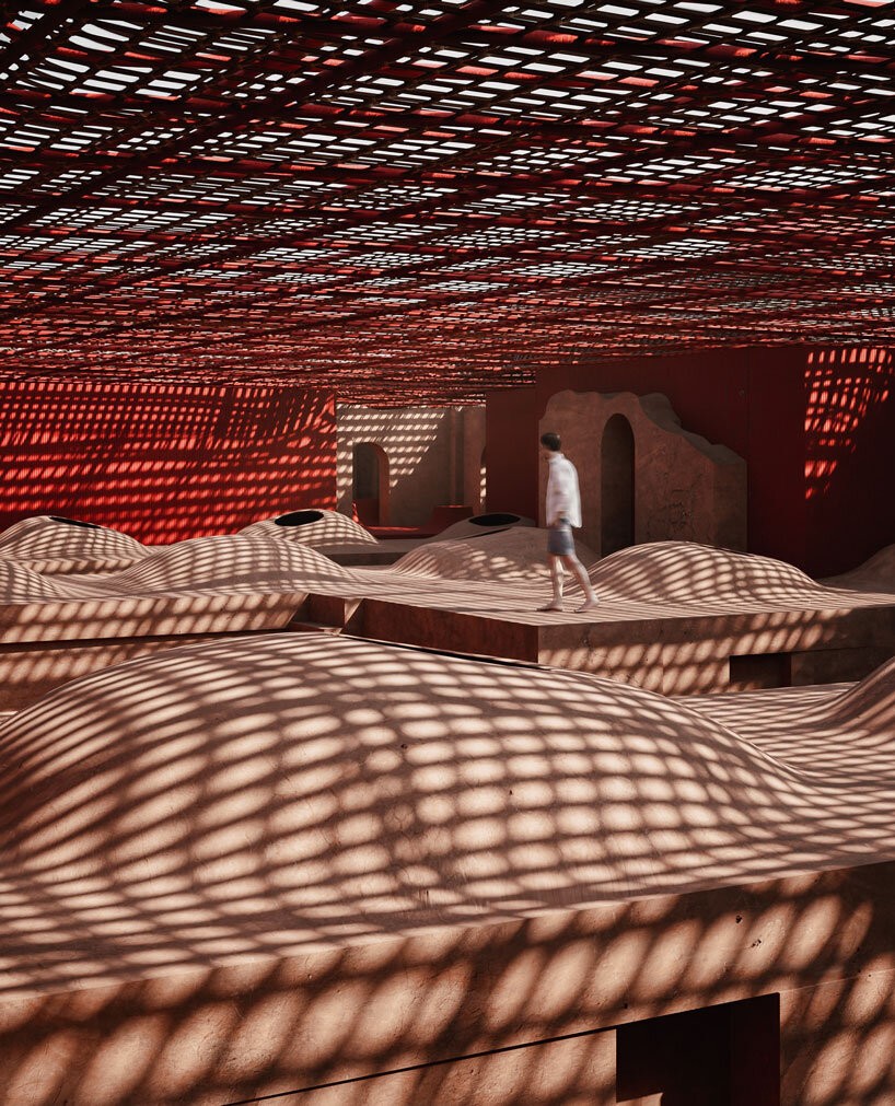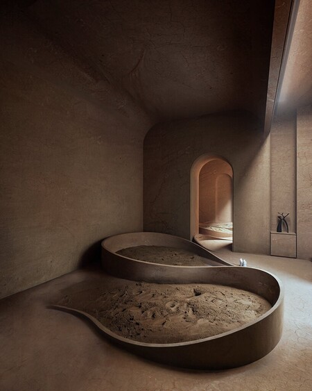 Концепция отеля построена как иммерсивное путешествие через четыре стихии (Земля, Огонь, Вода, Воздух), где гости последовательно перемещаются между тематическими зонами в течение двух дней. Навигация организована с помощью ярких красных элементов, создающих современный визуальный слой. Архитектура становится сценой для сенсорного опыта: тактильного контакта с материалами, наблюдения за световыми эффектами и взаимодействия с ландшафтом.