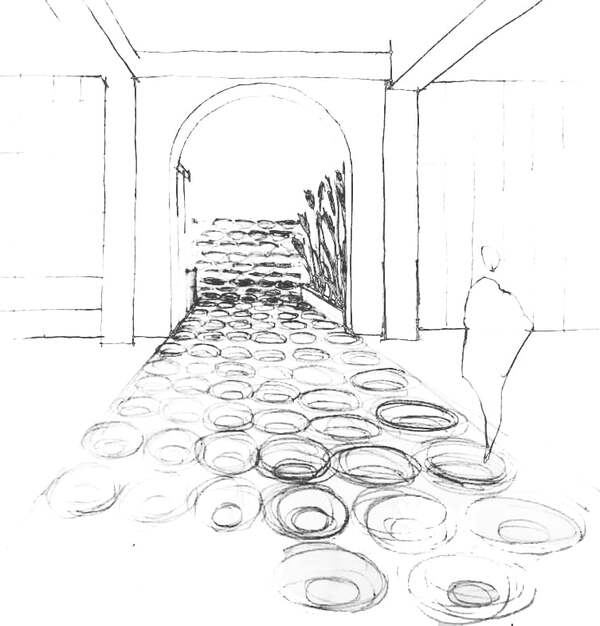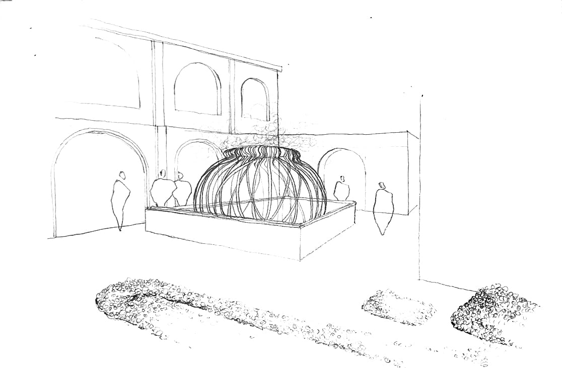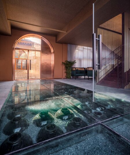 Этот приём также создаёт эффект «археологического раскопа» и отсылает к традиционным винокурням, где полы дворов сплошь покрывали такие ёмкости.