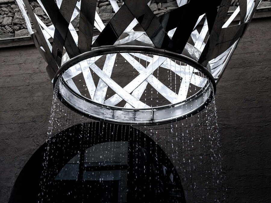 Наружные пространства являются частью этого сенсорного маршрута, создавая непрерывность между интерьером и экстерьером. Инсталляция, расположенная в главном дворе, напоминает о превращении жидкости из пара в конденсат в капли алкоголя.