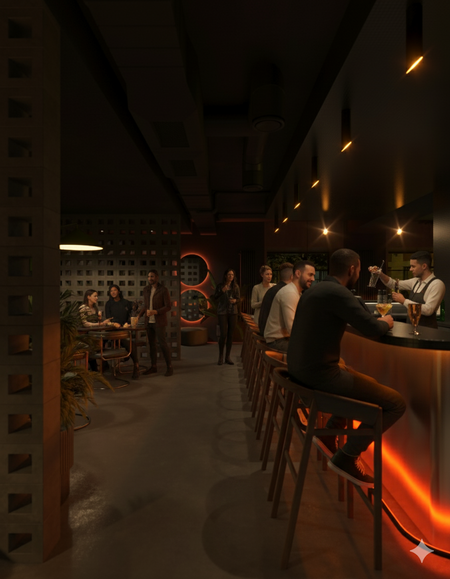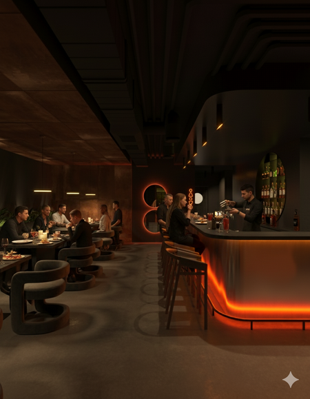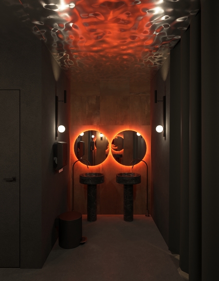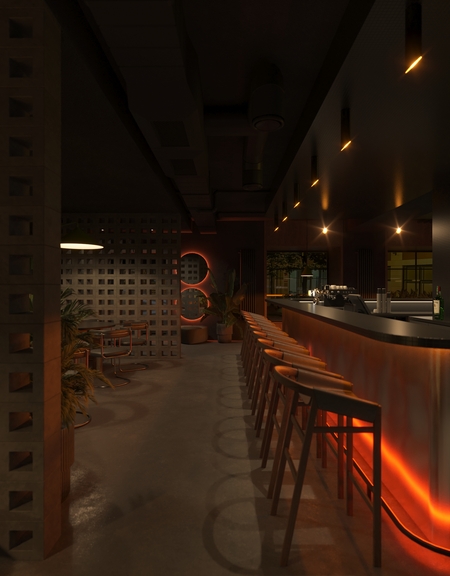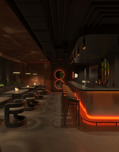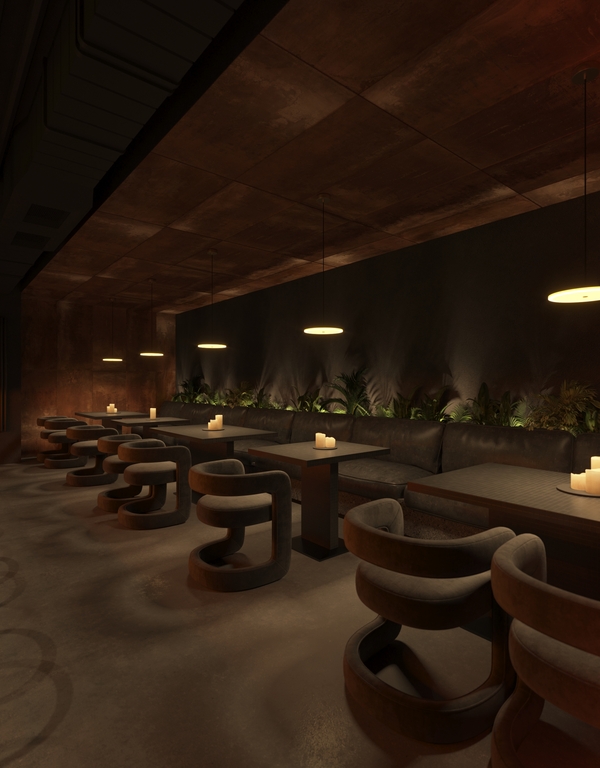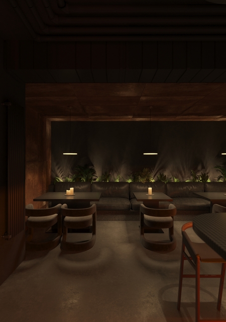 Rust & Coal — это современное гастрономическое пространство, вдохновлённое эстетикой индустриального прошлого и первобытной силой огня. Пространство построено на диалоге металла и угля, света и тени: массивные бетонные блоки, графитовые плоскости и медно-рыжие акценты создают ощущение монолитной убежденности, в то время как живое пламя, мягкая подсветка и органика растений добавляют интимности и тепла. Пространство создано для тех, кто ценит честные вкусы, глубокие оттенки и атмосферу внутреннего жара.