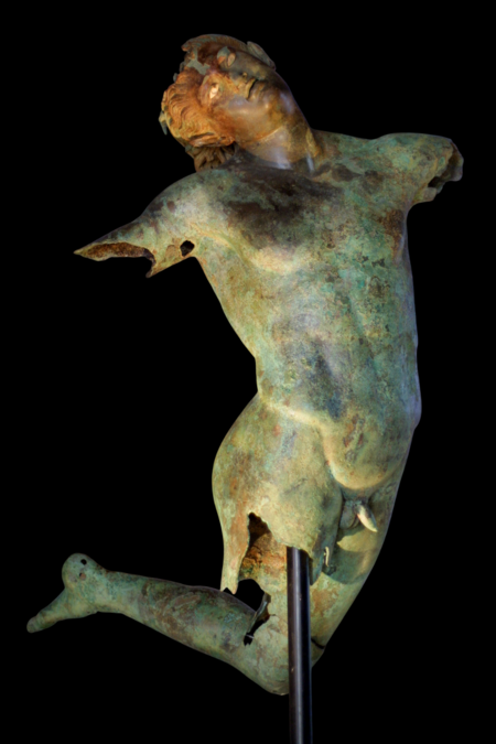 Это большая бронзовая статуя сатиры (или фавна), найденная у побережья Сицилии. Автор неизвестен; скульптура, судя по всему, создана в эллинистическую эпоху (ок. IV в. до н. э.). Сатир запечатлён в прыжке: голова отброшена назад, спина прогнута, а волосы будто взлетают от движения. Такая поза и «защёлкнутый» момент (как в замедленной съёмке) передают взрыв энергии и радостного экстаза. Несмотря на повреждения (отсутствуют рук и ноги), фигура кажется чрезвычайно живой — стоит лишь обратить внимание на контраст между напряжённым телом и ритмичным изгибом фигуры.