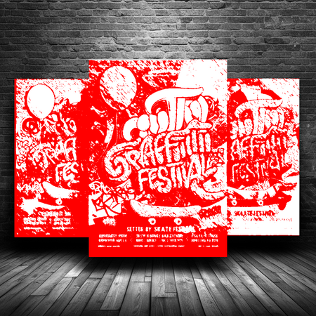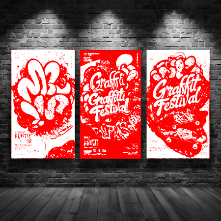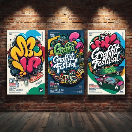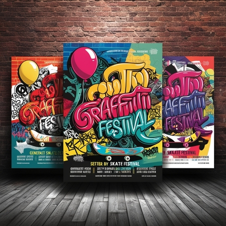 промпт: Generate three vibrant posters for a graffiti festival set against a textured brick wall background, showcasing the dynamic fusion of graffiti calligraphy, bombing, and tagging styles, with bold, colorful balloon letters and stylized skateboards, featuring intricate details and abstract shapes, with a mix of thin and thick lines, varied font sizes, and contrasting colors, capturing the essence of urban street art, with subtle shadows and highlights to give the posters a sense of depth and dimensionality, and a dash of rebellious spirit.