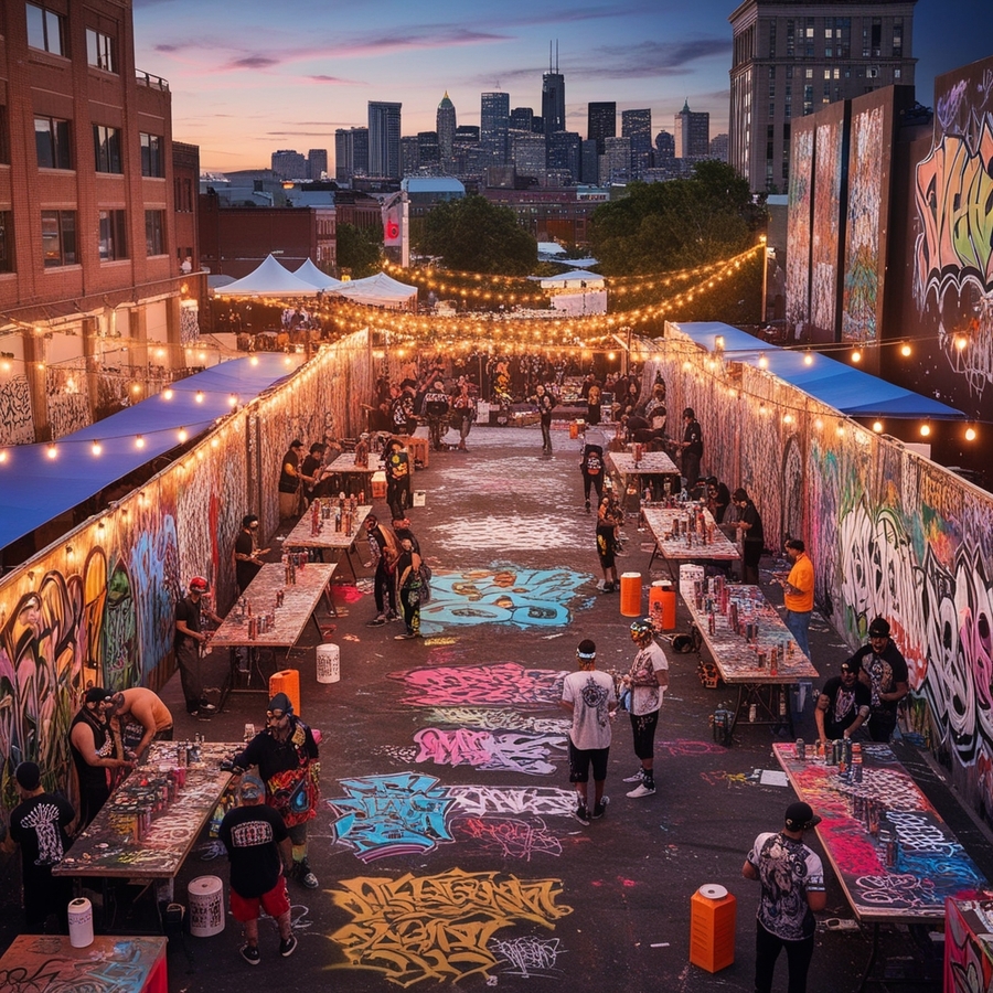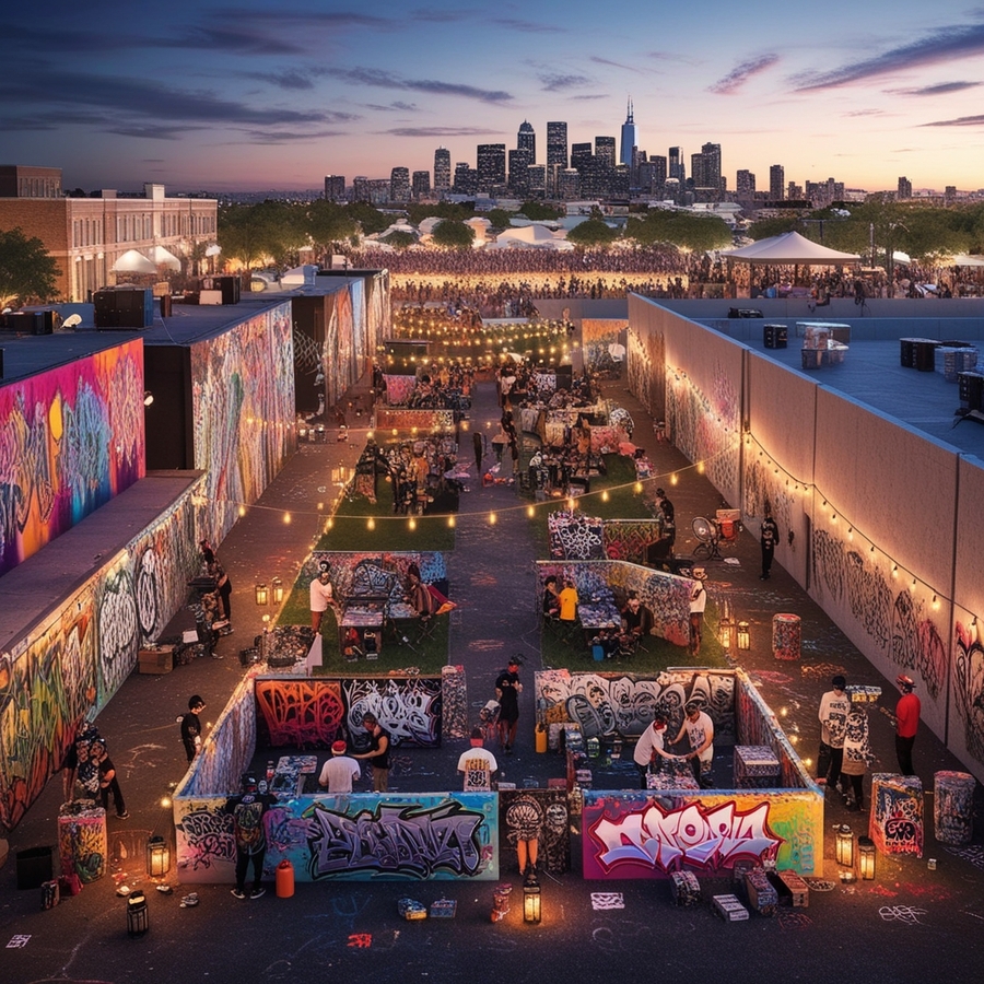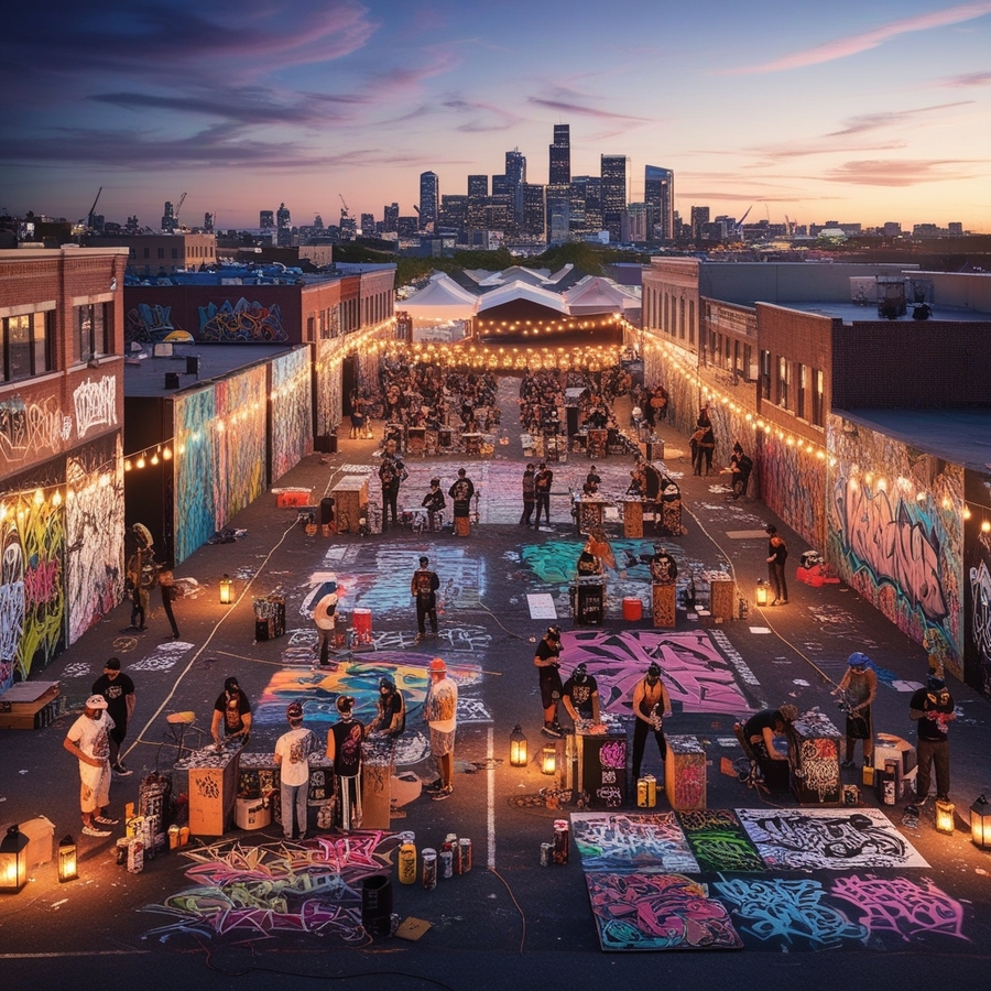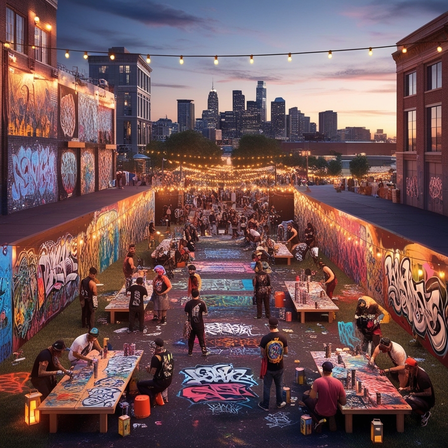 промпт: A vibrant, urban cityscape at dusk sets the stage for a dynamic graffiti festival, with a vast, open lot serving as a canvas for artists to unleash their creativity. The atmosphere is electric, with a warm, golden glow emanating from string lights and lanterns scattered throughout the area. Colorful murals and tags adorn the walls, buildings, and streets, showcasing a diverse range of styles, from abstract to realism. Graffiti artists, each with their unique accessories and attire, busily work on their latest masterpieces, surrounded by spray paint cans, stencils, and sketchbooks. The air is filled with the sounds of lively chatter, music, and the occasional hiss of aerosol cans. In the distance, a city skyline rises, with sleek skyscrapers and bustling streets, providing a striking contrast to the lively, artistic chaos of the festival
