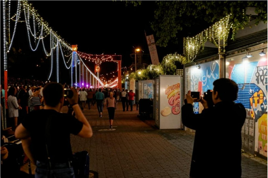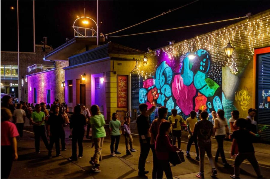 промпт: photo zone for graffiti festival evening garland street people take photos against graffiti background