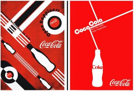 Расположение текста, чистые цвета и простые фигуры легли в основу рекламных плакатов CocaCola.