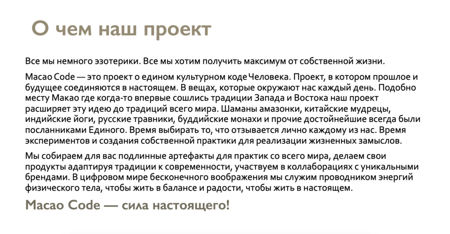 Macao Code — это личный бренд, за которым стоит определенный человек, создатель. Каждый человек индивидуален по-своему. То, как мы смотрим на мир, под каким углом, формирует нас и наше окружение. Есть такие моменты, когда нам хочется остановить время, ощутить присутствие и запечатлеть мгновение. Бренд Macao Code — это способ поделиться открытиями которые создатель совершил и испытал на протяжении жизни. Путешествуя по миру, он открывал для себя местные целительные ритуалы и множество целебных, мощных ингредиентов для своего Бренда