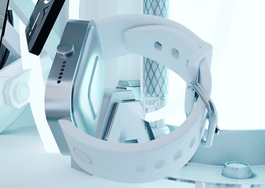 В центре витрины представлены последние устройства бренда, а манипуляторы, и круговые лампы подчеркивают технологичность.