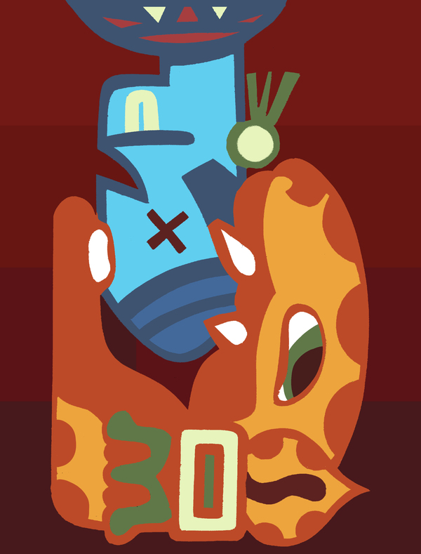 В выборе палитры я опиралась на цвета характерные среде майя: теплые и натуральные, которые использовались для керамики. Поэтому от них я позаимствовала зеленый, бордовый и терракотовый. Для контраста — синий с голубым, чтобы отделить персонажа от ягуара и показать что он уже неживой и холодный.