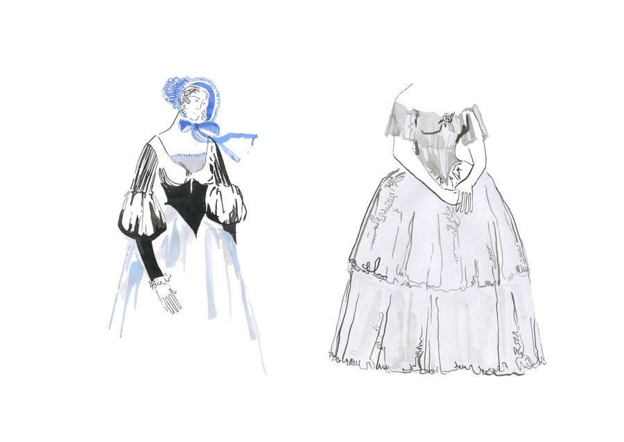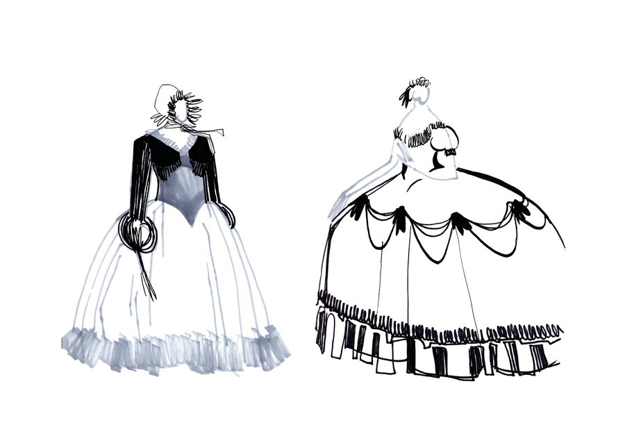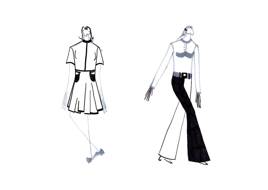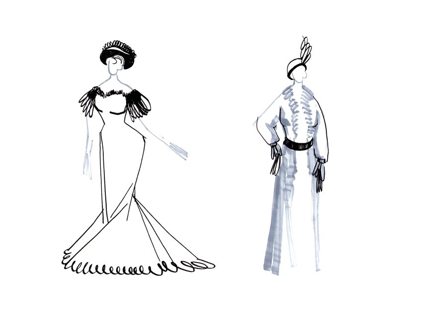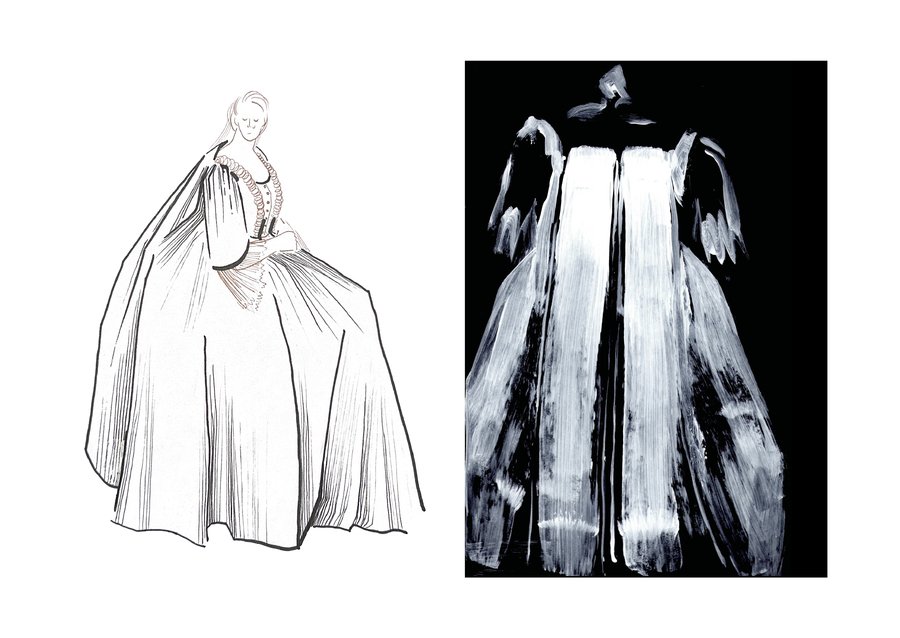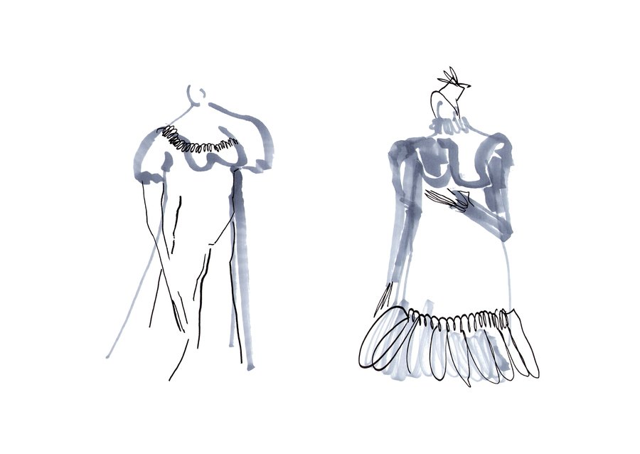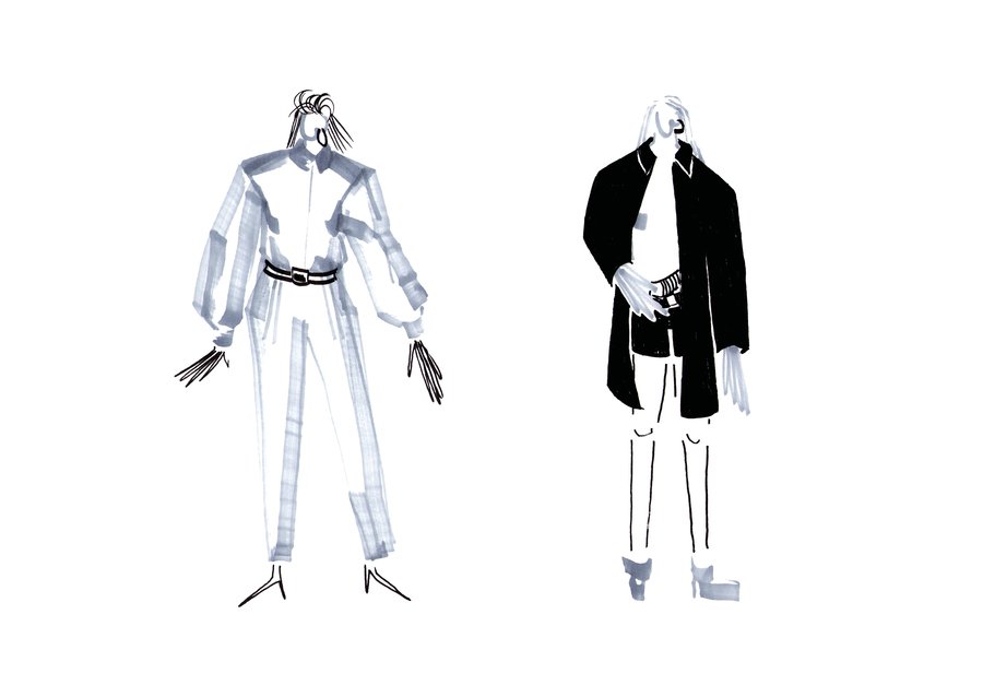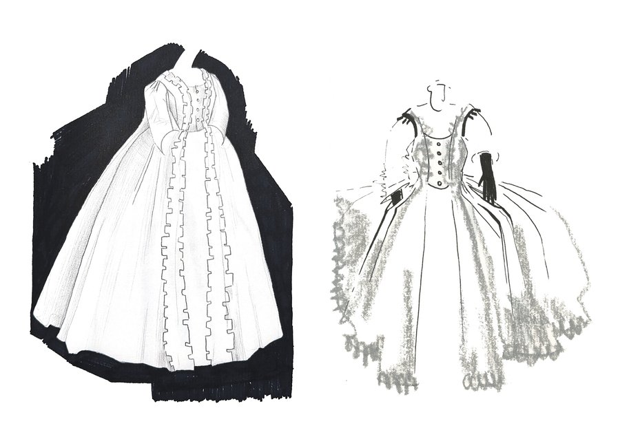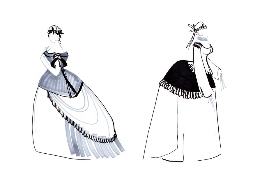 1-й блок направлен на изучение и прорисовку костюма или предмета костюма по КП в различных графических приемах, стилях, идеях