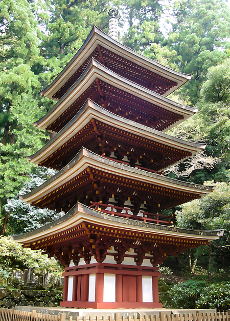 Данная пагода является представителем буддизма. Это сооружение идеально вписывается в окружающую природу, сочетаясь и гармонируя.Основным материалом служит дерево и камень-кажется, что пагода является продолжением скалы, на которой расположена.Пропорции погоды вытянуты, крыша добавляет изящности вместе с ажурными деталями на кронштейнах и изогнутой кровле.