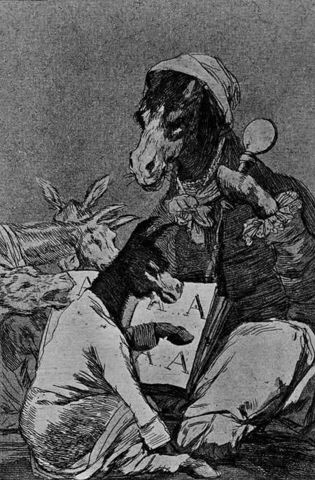На первом офорте учитель и ученики представлены в виде животных. В серии художник часто будет применять этот метод, наделяя людей животными, нечеловеческими чертами. Так Гойя указывает на озлобленность и глупость персонажей своих сюжетов. Главным героем офорта «А не умнее ли ученик?» стал осел — символ глупости. Автор иронизирует над тем, что учитель не только глуп, но и имеет высокое самомнение, о чем говорит его праздничный наряд: бант на шее и кружевные манжеты. На это Гойя ссылается и в описании к картине: «более важной… особы… невозможно сыскать». Но в этом сюжете не только высмеивается глупость педагогов, но и поднимается вопрос, кем вырастут те, кого они обучают, ведь на офорте показано, что ученики уже такие же упрямые животные, как и учитель.