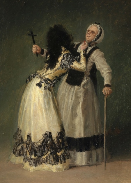 Серия офортов «Капричос» стала неким переходом от светлых картин повседневной жизни к освещению людских пороков и тяжестей жизни. Гойя создал эту серию после потери слуха, которая стала неким началом его пугающих картин. Его взгляд стал более критичным, и художник решил высмеять все, что было несправедливым и пугающим. Гойя не обошел стороной ни одну из самых волнующих его тем: начиная с церкви и образования, заканчивая проституцией.