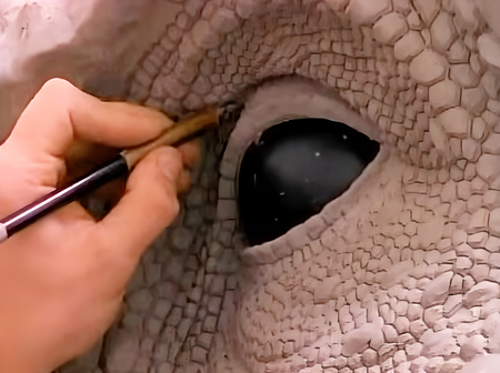 После на макет натягивали сетку из проволоки, покрывали стеклопластиком и глиной. Далее стекловолоконную ткань вкладывали в форму из эпоксидной смолы. Кожу создавали, используя вспененную крашеную резину. Готовые детали натягивали на механизированный макет. При создании кожи использовали глину ROMA и вырисовывали текстуру кожи динозавра.