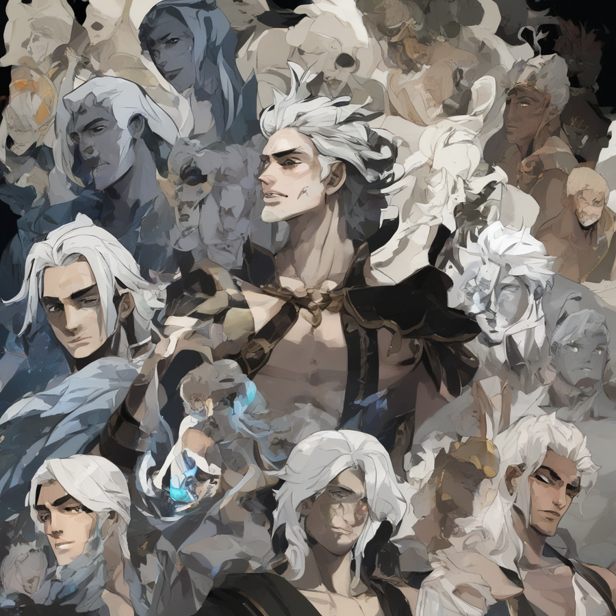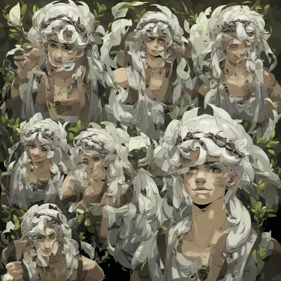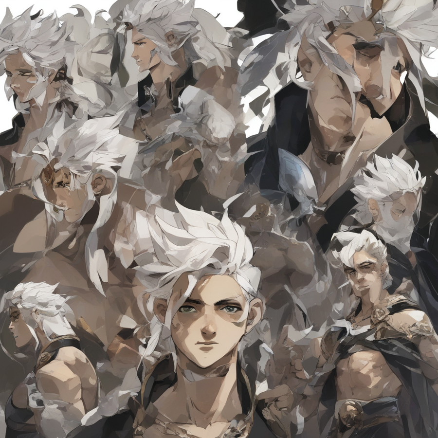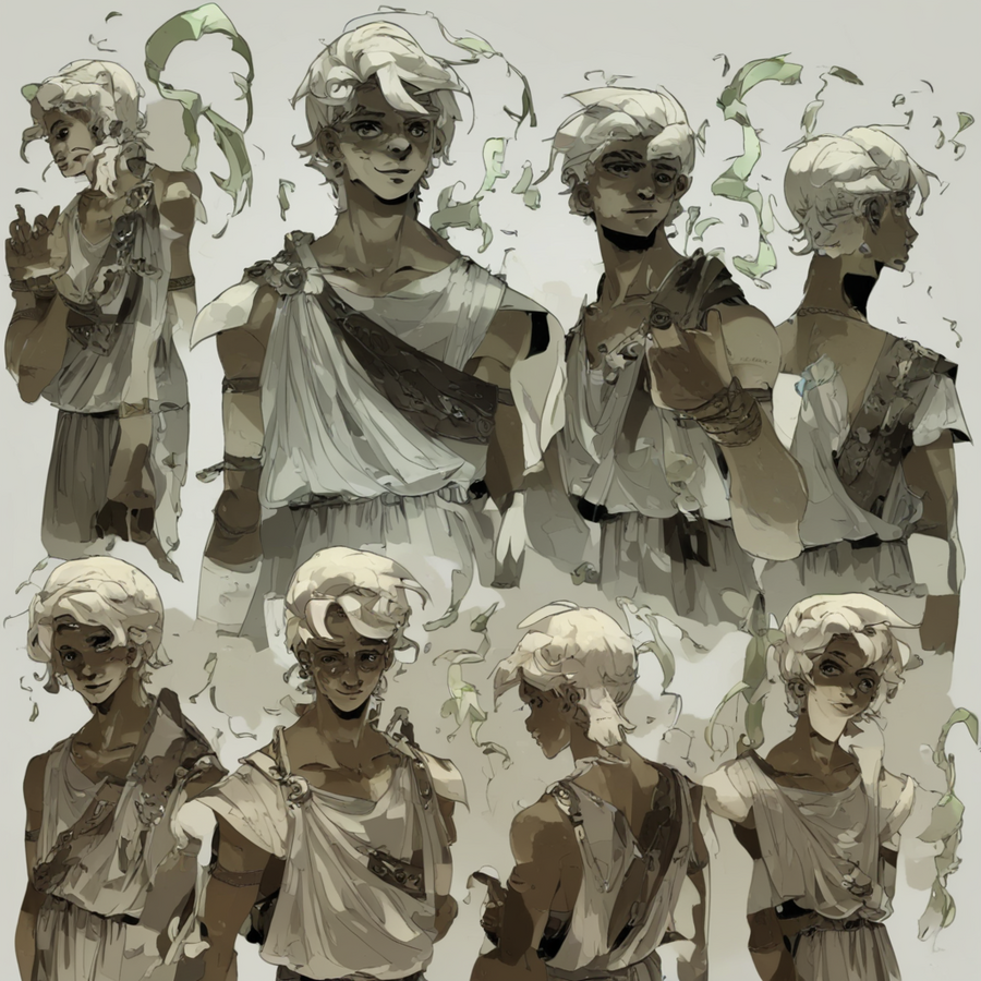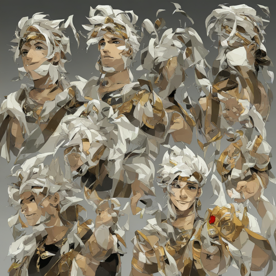 В итоговой серии мы видим героев античного мифа. Оригинальный стиль сочетает аниме-динамику, комиксную пластику и ренессансную монументальность. Главный акцент — мощная стилизация анатомии, выразительные эмоции и символизм через одежду/аксессуары. Эти черты нейросеть воспроизвела точно (особенно одежду!).