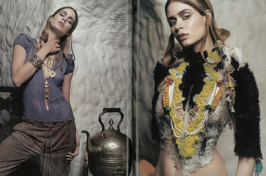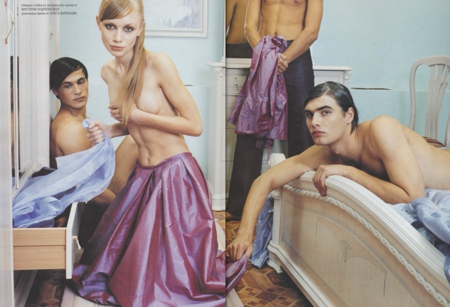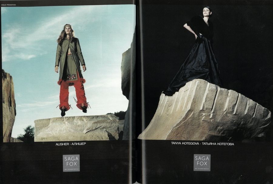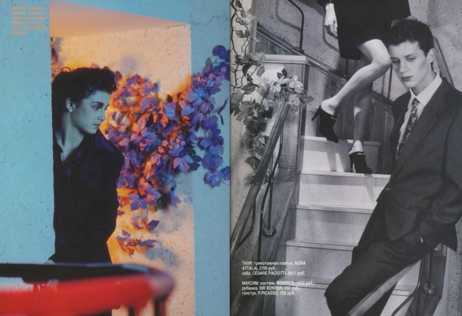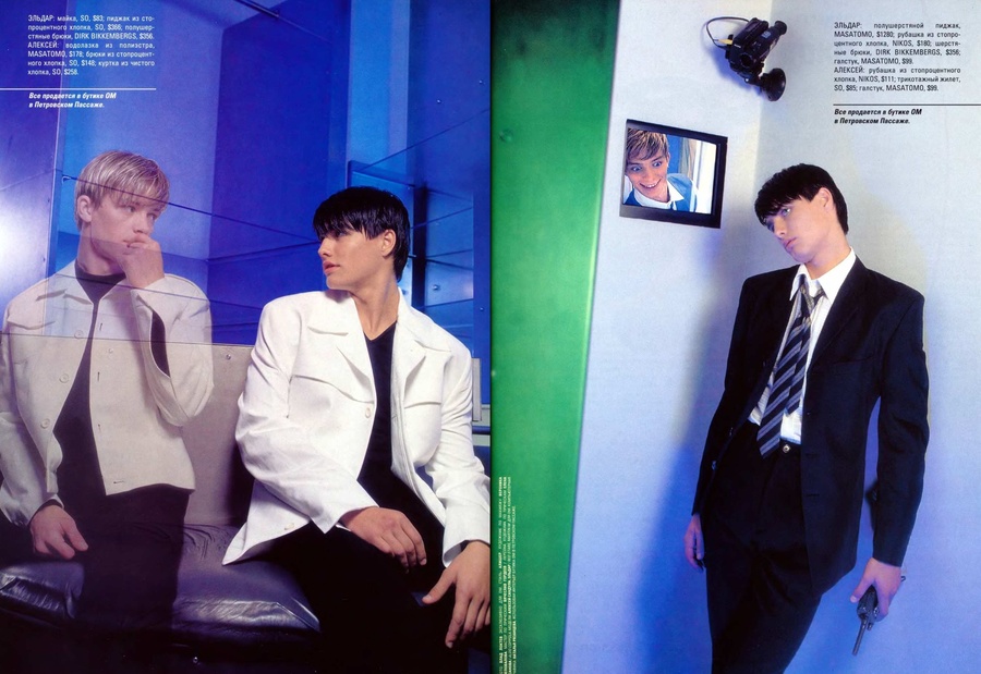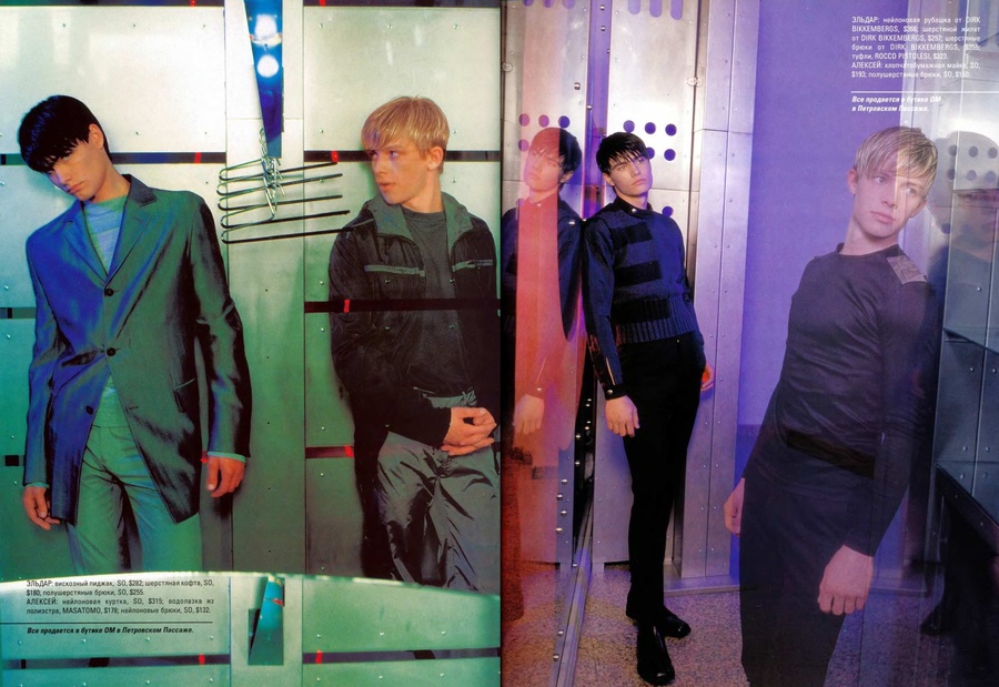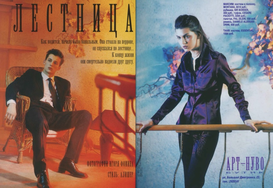 Алишер: В те годы профессии «стилист» не существовало, да и «дизайнер» звучало непривычно — всех называли «модельерами». Я познакомился с Игорем Григорьевым из журнала «ОМ», и через него — с фотографом Владом Локтевым. Я предложил Владу работать вместе. Так началась моя работа стилистом. Мы поставили дело на поток: я подбирал одежду, стилизовал и зарабатывал на этом.