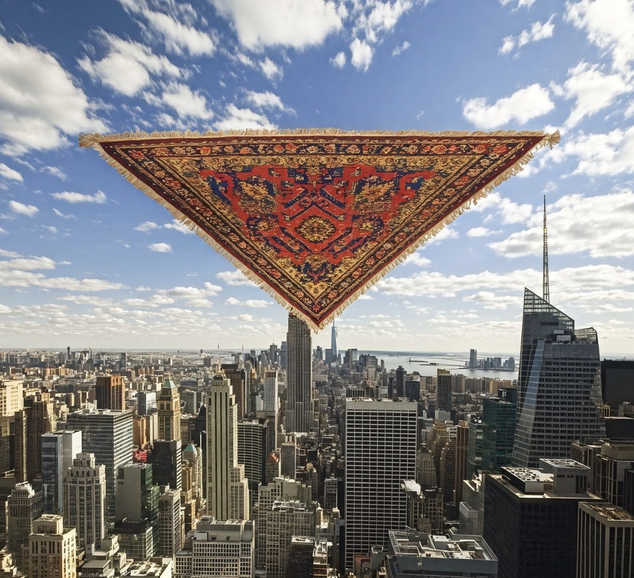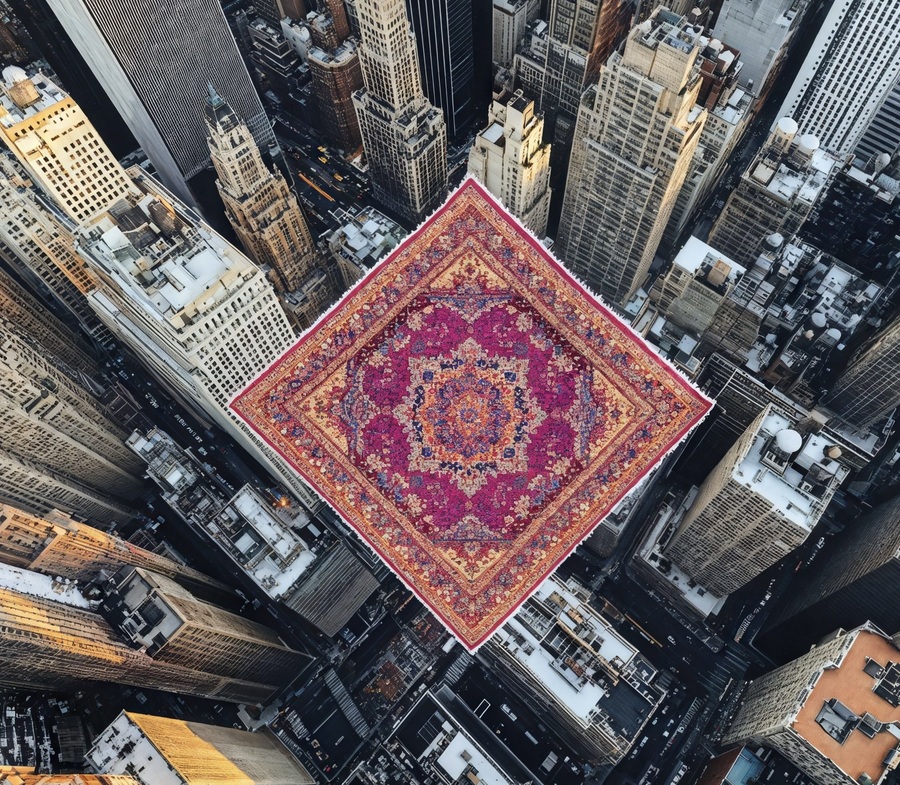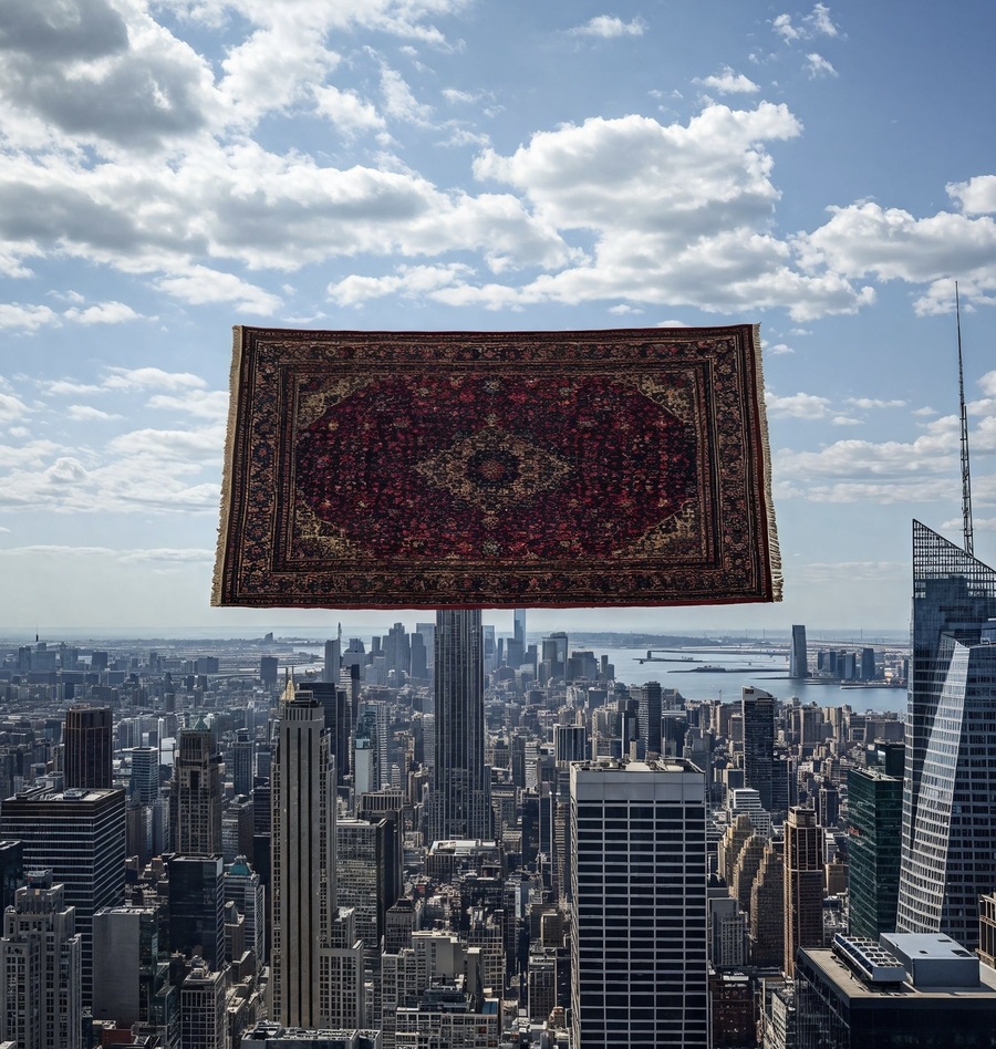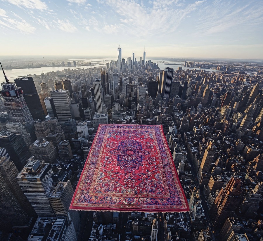 /a carpet that flies in the sky over the light New York, on the carpet sits a guy, he is dressed in a jacket and pants, with stubble, who is about 25-30 years old, you can see him, who is holding a small beautiful package, which contains orders (bag, glasses).