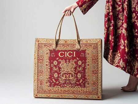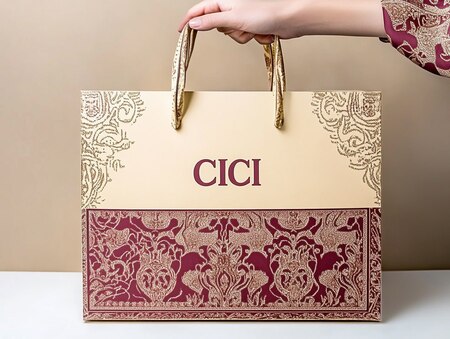 /a hyper realistic photo of a hyper realistic thick cardboard shopping bag for a women’s bag. The pattern on the bag is like on an Azerbaijani carpet. «CICI» is written in thin letters under the logo. the bag is on the light table. the color palette is burgundy, beige, gold. the woman’s hand holding a bag