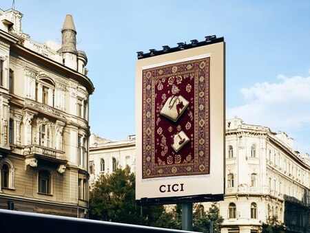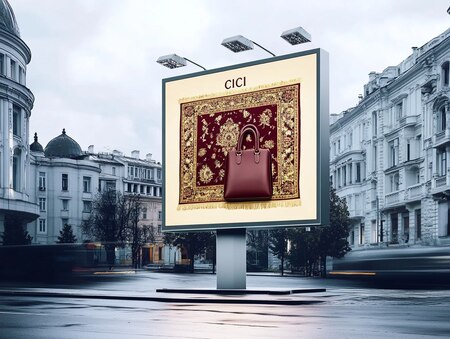 /hyper realistic billboard photo. billboard depicts the fashion campaign of bags. the bags are made of Azerbaijani carpet. The text «CICI» is written on the billboard. the color palette is burgundy, beige, gold. the aesthetic city in the background