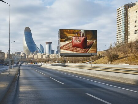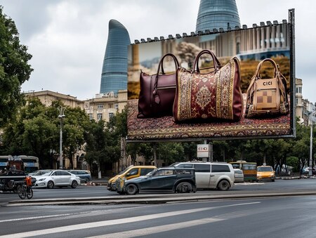 /hyper realistic billboard photo. billboard depicts the fashion campaign of bags. the bags are made of Azerbaijani carpet. The text «CICI» is written on the billboard. the color palette is burgundy, beige, gold. the aesthetic Baku city in the background