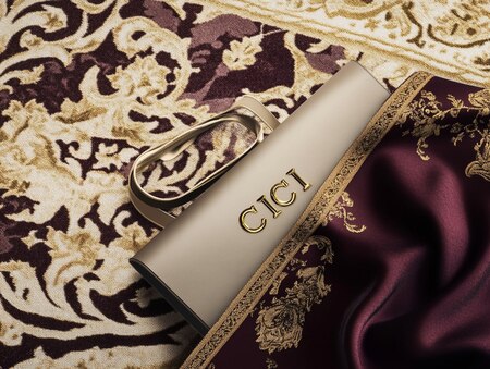 /a hyper realistic photo of a hyper realistic thik silk duster anther bag. The pattern on the box is like on an Azerbaijani carpet. «CICI» is written in thin letters. the color palette is burgundy, beige, gold