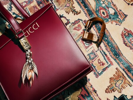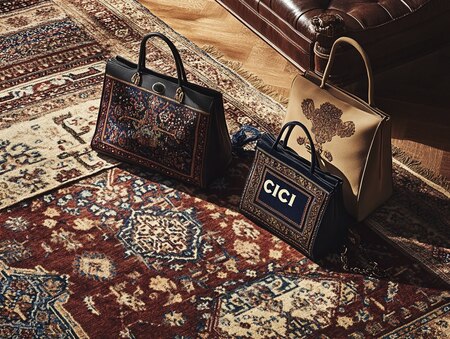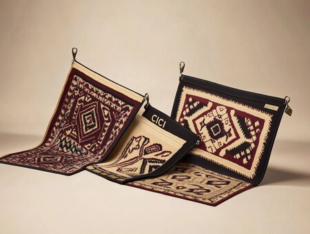 /hyper realistic fashion campaign photo. photo depicts the fashion campaign of bags. the bags are made of Azerbaijani carpet. The text «CICI» is written on the photo. the color palette is burgundy, beige, gold.