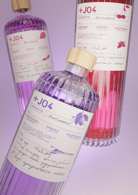 «+J04» — линейка натуральных лимонадов. Айдентика основана на любви и заботе о природе, поэтому упаковка устроена так, что допускается её повторное использование, также все материалы перерабатываемы. Серия состоит из трёх SKU: лаванда с лимоном, вишня с мятой и клубника с базиликом. Дабы подчеркнуть простоту и натуральность продукта, использованы сдержанные цвета, акцент на рельефе самой бутылки.