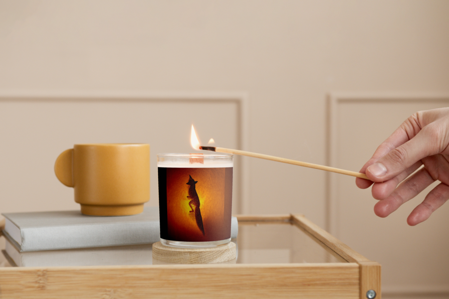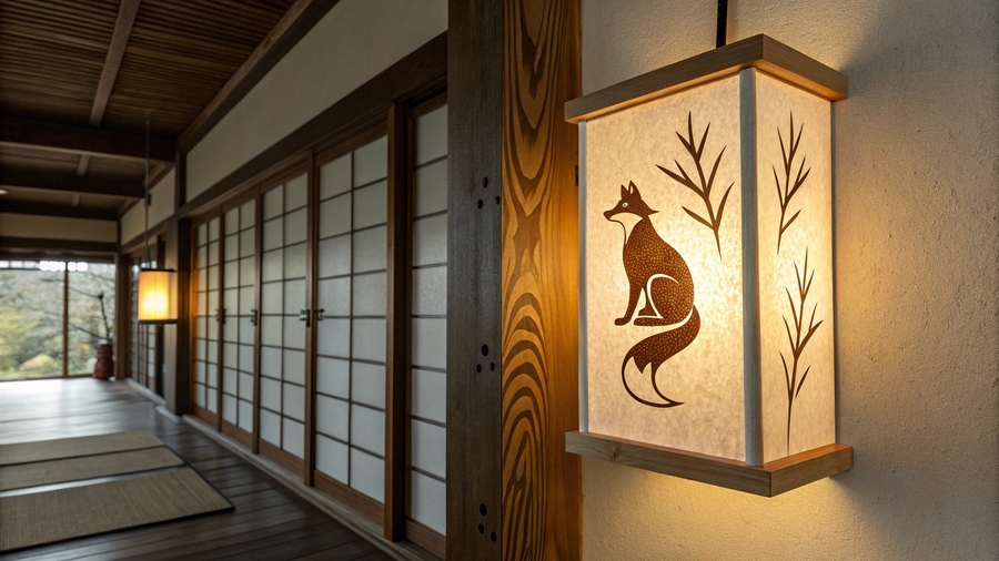 Промт: Atmospheric Japanese minimalist poster, warm amber light glowing in darkness, soft paper texture, wooden background, subtle fox silhouette made of light, cinematic composition, no text