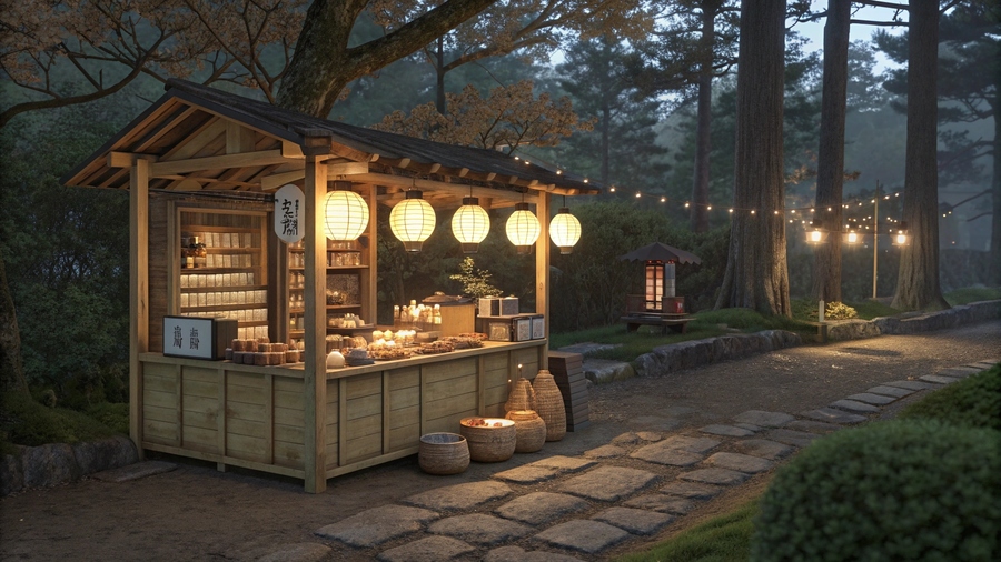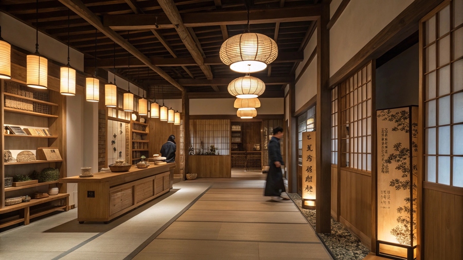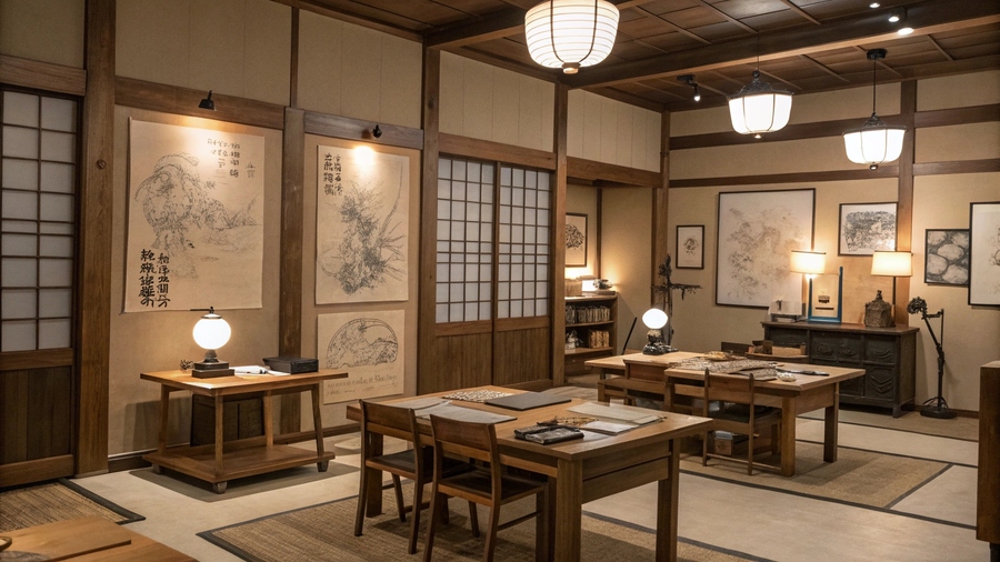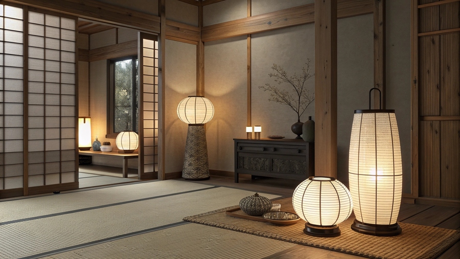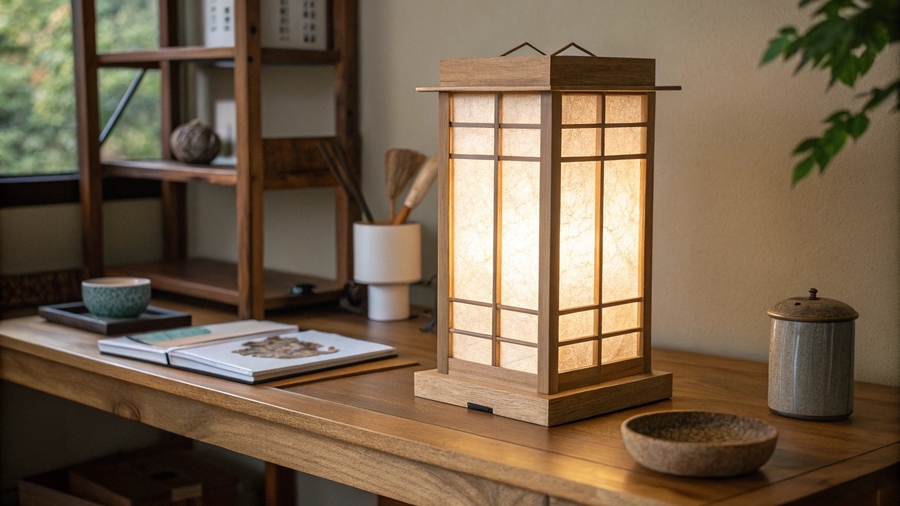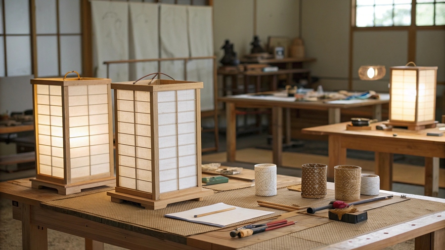 Промт: Artisan workshop making Japanese paper lamps, natural light, wooden tables with tools, washi paper, bamboo frames, calm handcrafted atmosphere, cinematic soft focus, no people, minimalist aesthetic