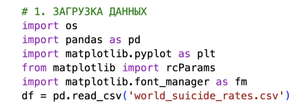 Для анализа я использовала датасет World Suicide Mortality Data 2000–2021, доступный на Kaggle и основанный на статистике Всемирного банка и Всемирной организации здравоохранения. В работе задействованы три ключевых поля: название страны, год и уровень суицидальной смертности на 100 000 человек. Выбор именно этого датасета обусловлен глобальным охватом — позволяет выявить как универсальные паттерны, так и региональные различия, и достаточной временной глубиной — 21 год истории позволяет отследить воздействие значительных исторических событий (финансовый кризис 2008 г., пандемия COVID-19 2019–2021 гг.) Датасет изначально включал не только отдельные страны, но и агрегированные регионы («Europe & Central Asia», «High income» и т. п.). Чтобы не искажать визуализацию, эти агрегаты были удалены: в итоговом анализе участвуют только суверенные государства.