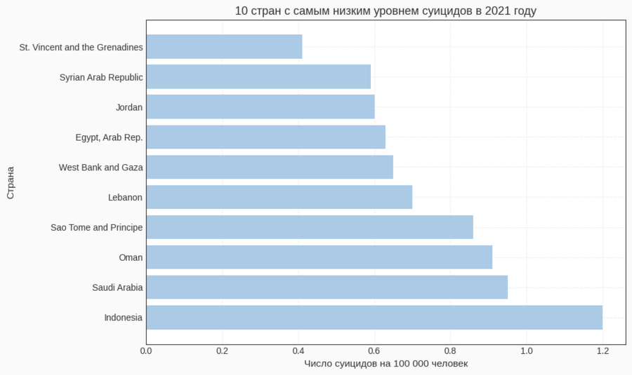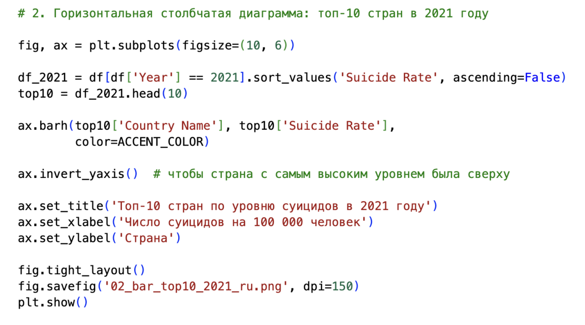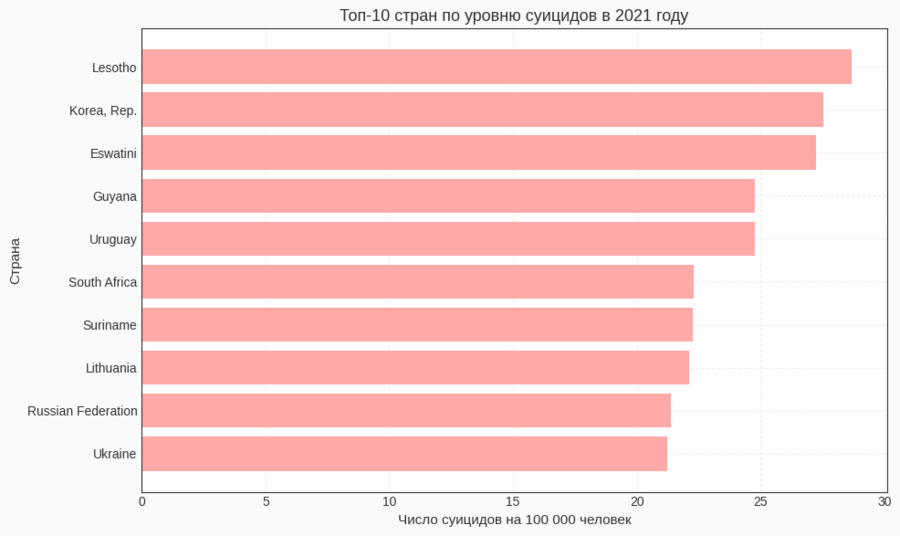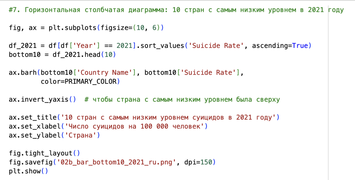 Для диаграмм «топ‑10» и «анти‑топ‑10» я отфильтровала данные за 2021 год (df[df['Year'] == 2021]), отсортировала по столбцу Suicide Rate и с помощью head (10) выбрала первые десять строк. Эти данные используются в двух горизонтальных bar‑графиках: один показывает страны с самыми высокими показателями, другой — с самыми низкими.