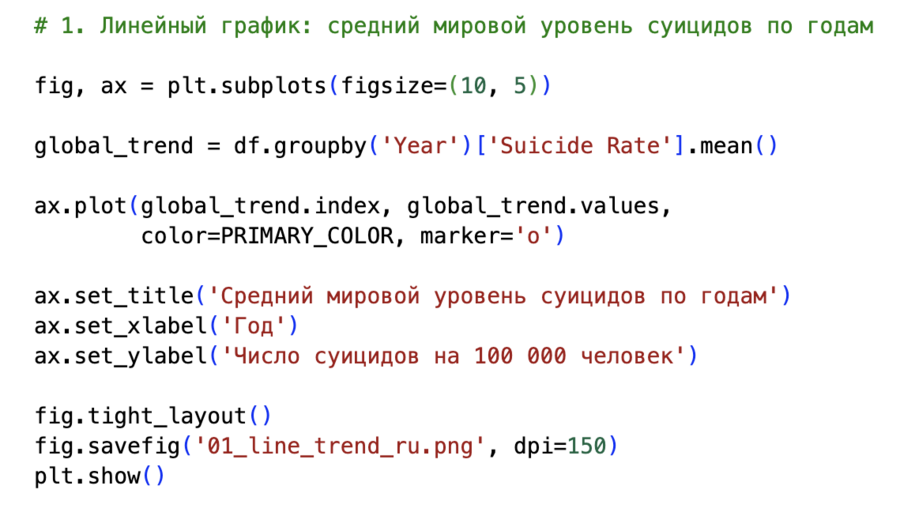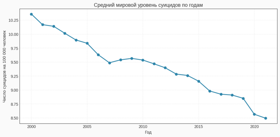 Для построения линейного графика среднемирового уровня я использовала группировку по году: groupby ('Year')['Suicide Rate'].mean (). Полученный временной ряд служит основой для первого графика, где виден общий спад уровня суицидов за 21 год.