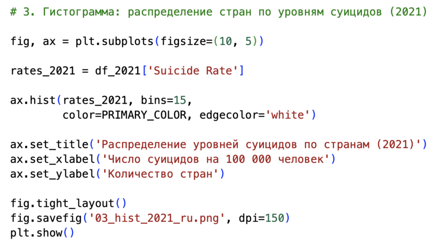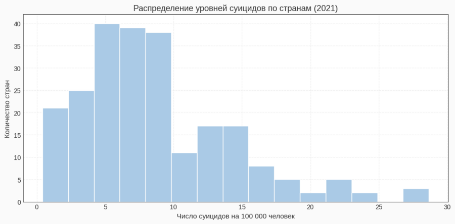 Для гистограммы я взяла столбец Suicide Rate за 2021 год и передала его в plt.hist с 15 бинами. Такой шаг позволяет оценить, как распределяются страны по уровню суицидов: сгруппированы ли они около низких значений или распределены равномерно.