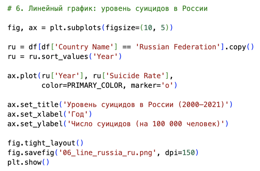 Для России был создан отдельный срез по строкам с Country Name == 'Russian Federation', отсортированный по году. На основе этого временного ряда построен линейный график, позволяющий увидеть динамику уровня суицидов именно в российском контексте.