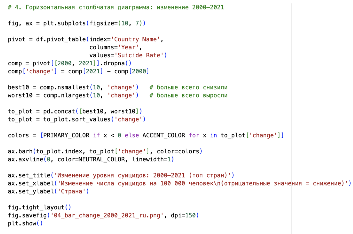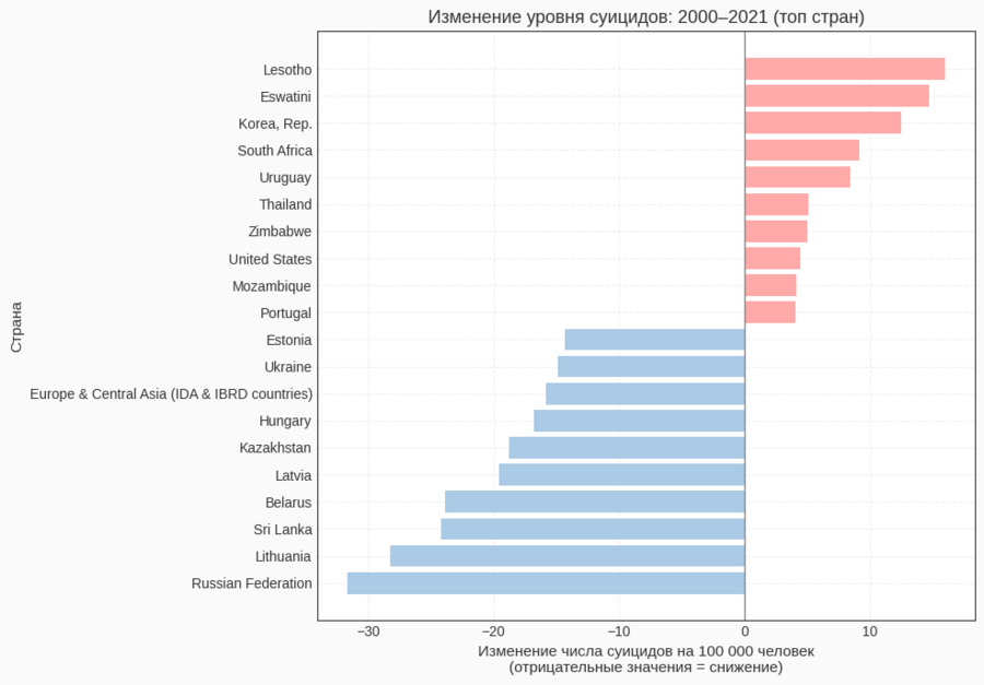 Чтобы сравнить уровни в двух временных точках, я построила сводную таблицу: pivot_table (index='Country Name', columns='Year', values='Suicide Rate'). После этого были выбраны только столбцы 2000 и 2021 годов, а строки с пропусками удалены. Новая колонка change рассчитывается как разность 2021 — 2000. По ней формируется два списка стран: с наибольшим снижением (отрицательные значения) и с наибольшим ростом (положительные). На их основе строится горизонтальная столбчатая диаграмма, в которой цвет столбцов показывает направление изменения.