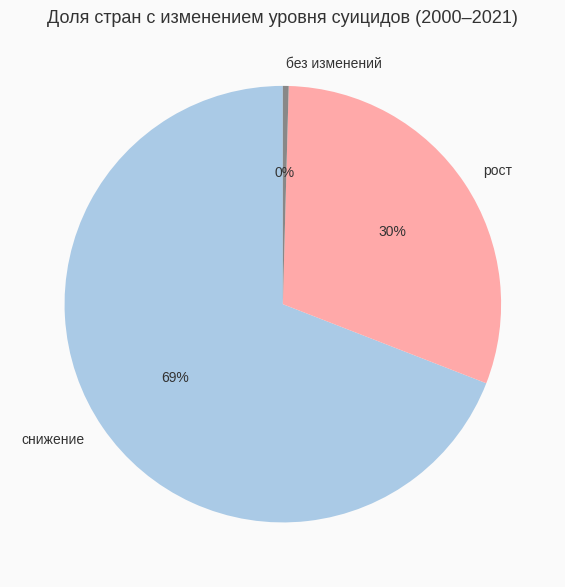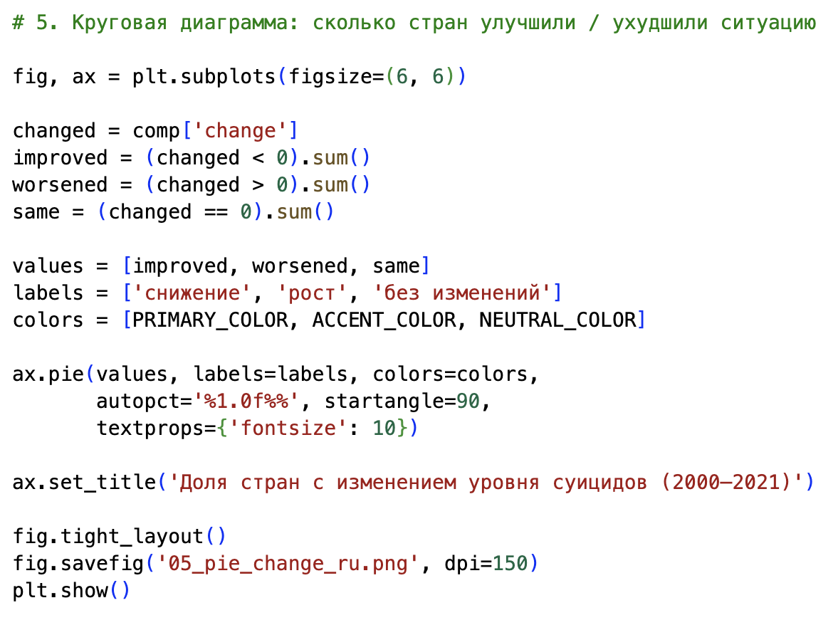 Круговая диаграмма построена на основе уже рассчитанной величины change (разница между уровнем суицидов в 2000 и 2021 годах для каждой страны). Я разделила все страны на три группы: те, где показатель снизился, вырос или практически не изменился. В коде это выражено через подсчёт количества значений change меньше нуля, больше нуля и равных нулю. Полученные числа были переданы в ax.pie вместе с подписи «снижение», «рост» и «без изменений». Эта диаграмма не добавляет новых «сырых» данных, но пересобирает уже имеющуюся информацию в максимально компактную, интуитивную форму: одним взглядом видно, какая доля стран движется в сторону улучшения, а какая — в сторону ухудшения. В моём случае большинство сегмента диаграммы занимает зона «снижение», что визуально подчёркивает позитивный тренд, о котором говорят и другие графики.