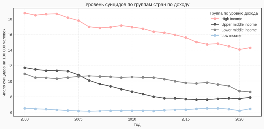 График показывает, что официально зарегистрированный уровень суицидов выше в группе стран с высоким доходом, чем в группах с низким и средним доходом. Это не означает, что индивидуальные «богатые люди» чаще совершают суицид: агрегированные данные по странам смешивают в себе качество учёта, культурные различия и структуру населения. Тем не менее, визуализация подчёркивает, что высокий уровень экономического развития сам по себе не гарантирует низких показателей суицидальной смертности.