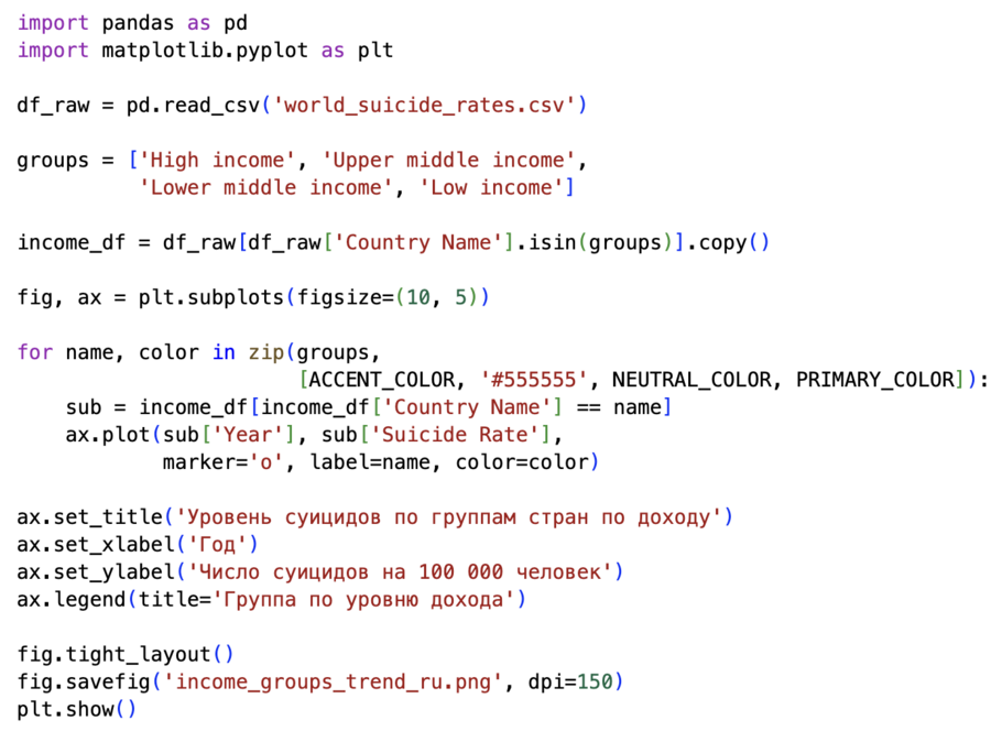 Отдельный набор визуализаций я посвятила сравнению стран не по географическому признаку, а по уровню дохода — в соответствии с классификацией Всемирного банка. Для этого я временно не удаляла агрегированные строки High income, Upper middle income, Lower middle income, Low income и собрала из них отдельный датафрейм income_df. Затем для каждой из четырёх групп был построен собственный временной ряд (год → уровень суицидов), и все четыре линии отображены на одном графике. Код использует простой цикл по списку groups: для каждой группы фильтруются строки, и вызывается ax.plot с отдельным цветом и подписью. Легенда оформлена как «Группа по уровню дохода». Этот график показывает, что высокий уровень официально зарегистрированных суицидов характерен прежде всего для группы стран с высоким доходом, тогда как в странах с низким доходом показатели ниже.