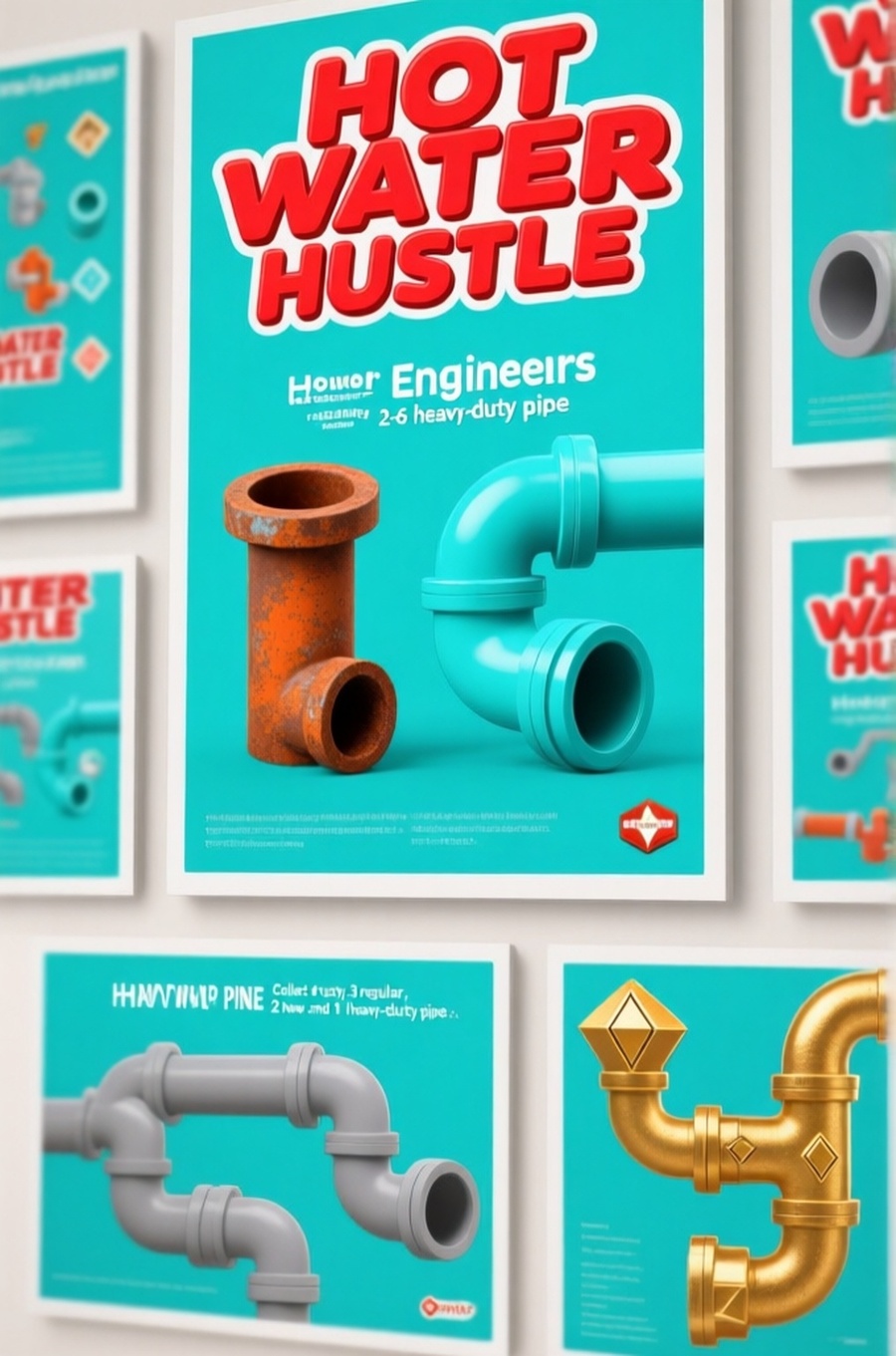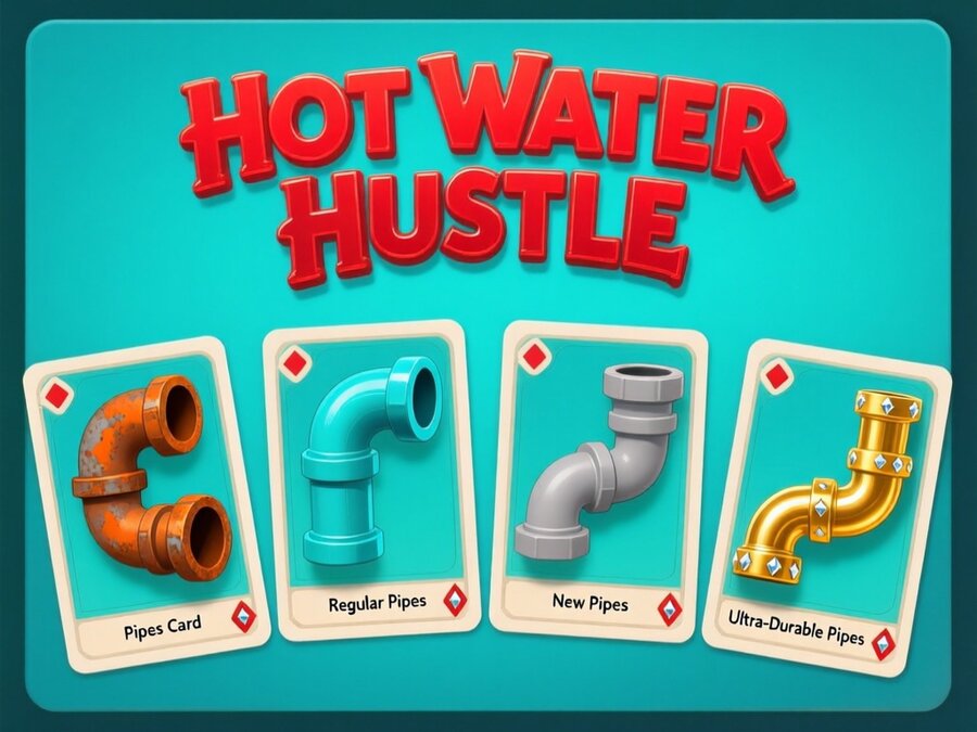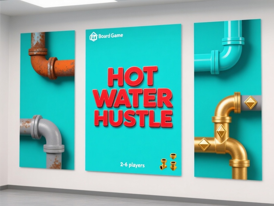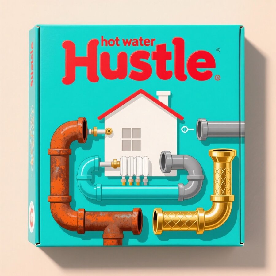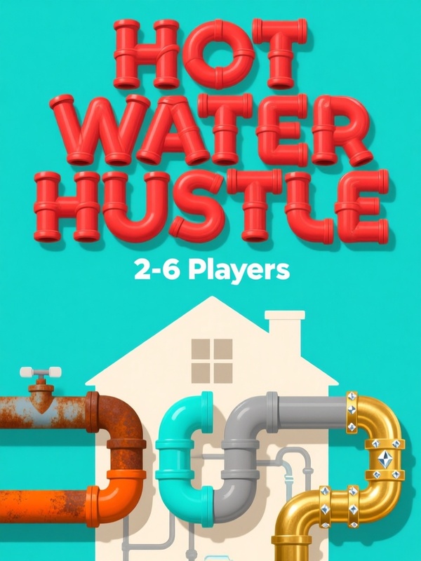 Create mockups with posters for a board game called «hot water hustle» about pipes, where players act as engineers who need to heat their house by assembling pipes and improving them. There are 4 types of pipes in the game: rusty, regular, new and heavy-duty. The rusty pipes are brown-orange in color and simple in shape, the usual ones are turquoise, the new ones are gray and more complex in shape, and the heavy-duty ones are gold with diamonds. The goal of the game is to collect a set of 4 rusty pipes, 3 regular pipes, 2 new pipes and 1 golden pipe before the other players. The palette of the box is turquoise in different shades with red. The font is red, the letters look like pipes. This game is designed for 2-6 people.