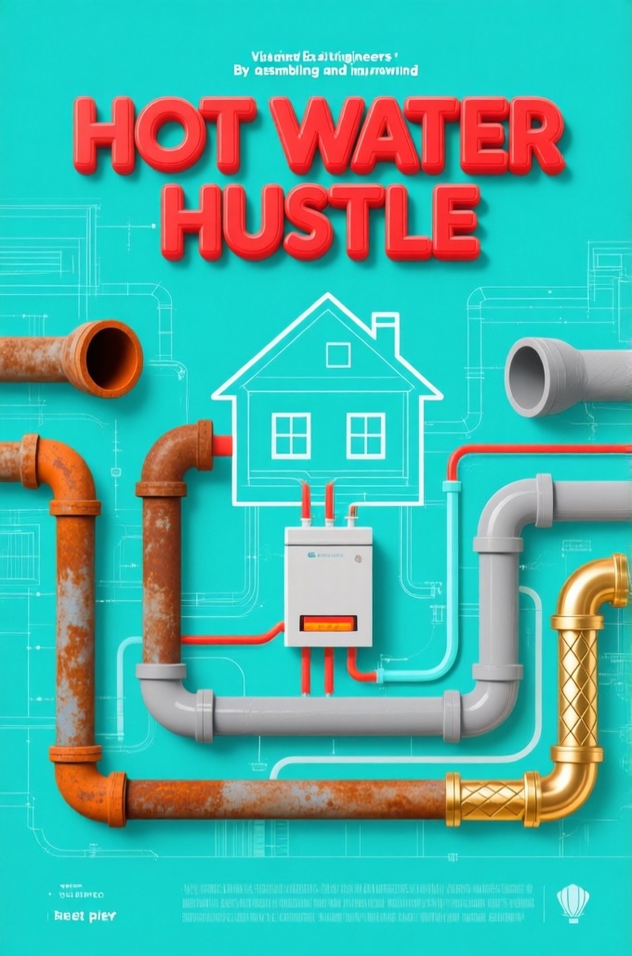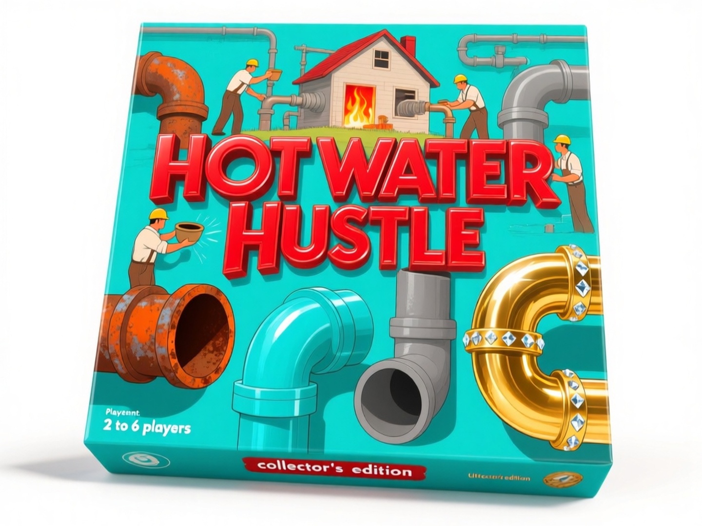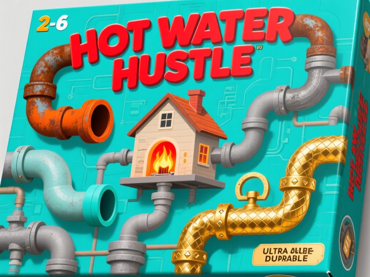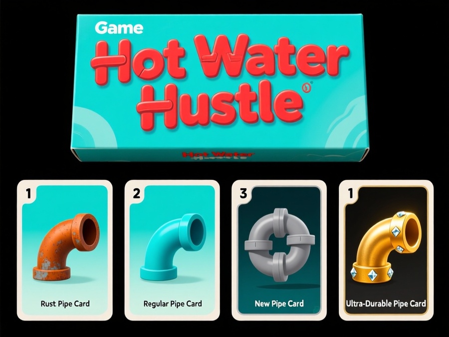 Create mockups with posters for a board game called «hot water hustle» about pipes, where players act as engineers who need to heat their house by assembling pipes and improving them. There are 4 types of pipes in the game: rusty, regular, new and heavy-duty. The rusty pipes are brown-orange in color and simple in shape, the usual ones are turquoise, the new ones are gray and more complex in shape, and the heavy-duty ones are gold with diamonds. The goal of the game is to collect a set of 4 rusty pipes, 3 regular pipes, 2 new pipes and 1 golden pipe before the other players. The palette of the box is turquoise in different shades with red. The font is red, the letters look like pipes. This game is designed for 2-6 people.