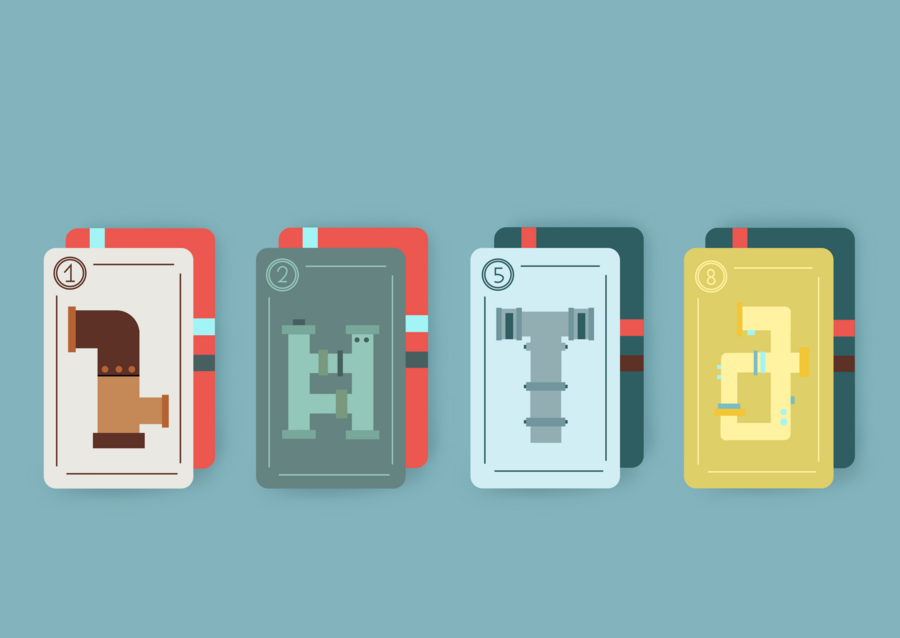 Generate different images of a cards for a board game called «hot water hustle» about pipes, where players act as engineers who need to heat their house by collecting pipes and improving them. There are 4 types of pipes in the game: rusty, regular, new and ultra-durable. The rusty pipes are brown-orange in color and simple in shape, the usual ones are turquoise in color, the new ones are gray in color and more complex in shape, and the ultra-durable ones are gold with diamonds. The goal of the game is to collect a set of 4 rusty pipes, 3 regular pipes, 2 new pipes and 1 gold pipe before other players. The palette of the box is turquoise in different shades with red. The font is red, the letters look like pipes.