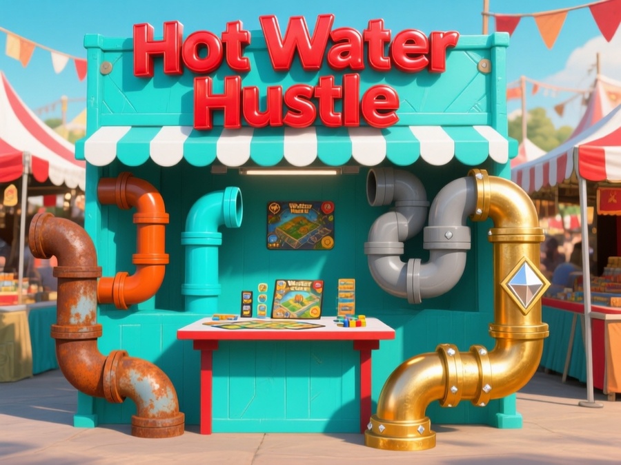 Create poster images for a board game called «hot water Hustle» about pipes, where players act as engineers who need to heat their house by assembling pipes and improving them. There are 4 types of pipes in the game: rusty, regular, new and heavy-duty. The rusty pipes are brown-orange in color and simple in shape, the usual ones are turquoise, the new ones are gray and more complex in shape, and the heavy-duty ones are gold with diamonds. The goal of the game is to collect a set of 4 rusty pipes, 3 regular pipes, 2 new pipes and 1 golden pipe before the other players. The palette of the box is turquoise in different shades with red. The font is red, the letters look like pipes. This game is designed for 2-6 people. Based on this information, create a marketplace at a fair or festival where you can present such a board game. It should be a stand decorated in the theme and color scheme of the game. There should be a table with game components on the stand.