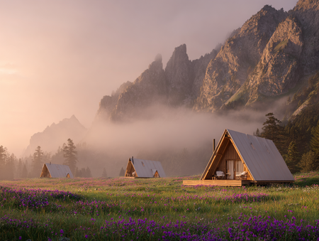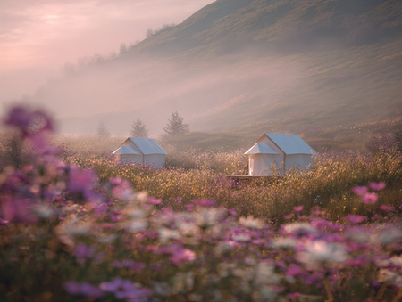 Промпт: generate glamping spaces in the mountains.There should be one of the houses in the foreground. The cabins should look like modern comfortable tents. there should be houses in the space located in a flower meadow obscured by fog, flooded with sunlight.serene meadow at magic hour, soft focus .swaying gently in the breeze, ethereal mist, warm glowing light, dreamy and peaceful, loopable video background. --v 7 --ar 4:3